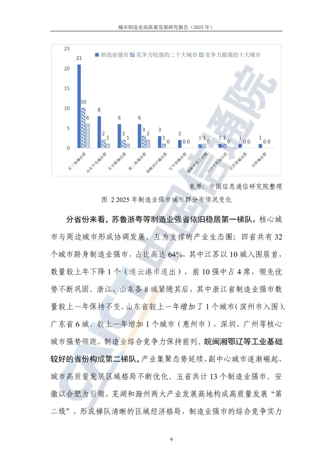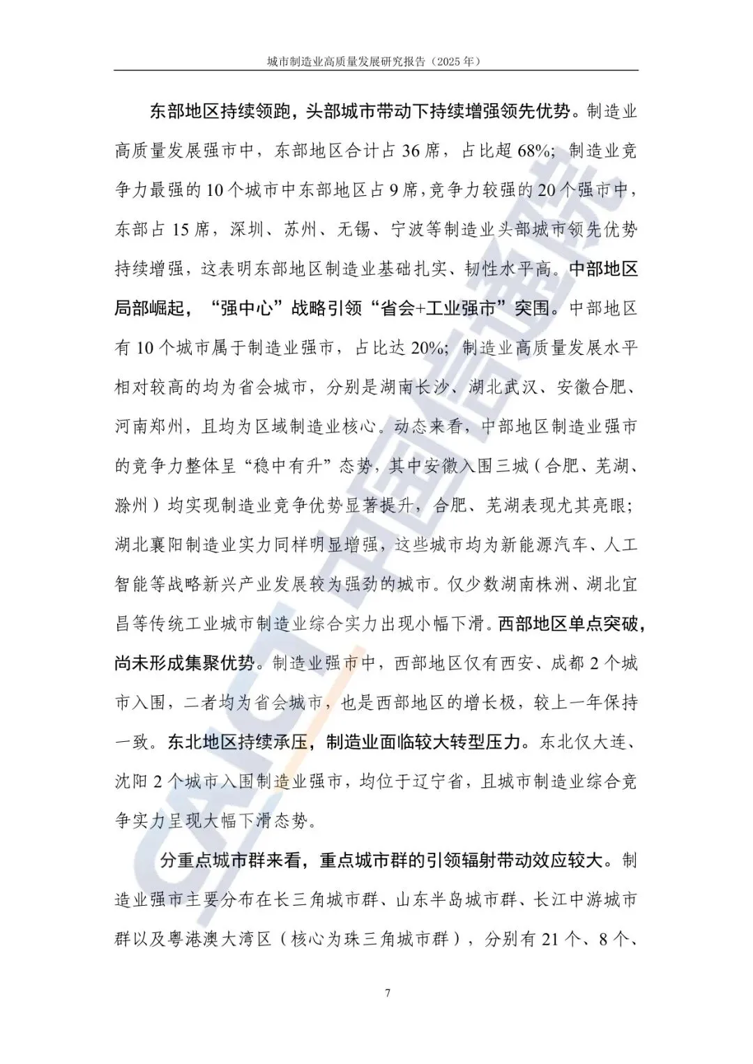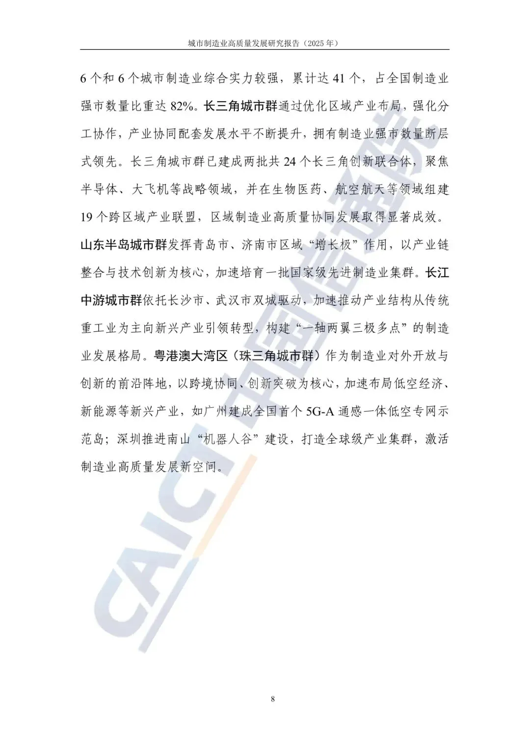 分重点城市群来看,重点城市群的引领辐射带动效应较大。制造业强市主要分布在长三角城市群、山东半岛城市群、长江中游城市群以及粤港澳大湾区(核心为珠三角城市群),分别有21个、8个、6个和6个城市制造业综合实力较强,累计达41个,占全国制造业强市数量比重达82%。长三角城市群通过优化区域产业布局,强化分工协作,产业协同配套发展水平不断提升,拥有制造业强市数量断层式领先。长三角城市群已建成两批共24个长三角创新联合体,聚焦半导体、大飞机等战略领域,并在生物医药、航空航天等领域组建19个跨区域产业联盟,区域制造业高质量协同发展取得显著成效。山东半岛城市群发挥青岛市、济南市区域“增长极”作用,以产业链整合与技术创新为核心,加速培育一批国家级先进制造业集群。长江中游城市群依托长沙市、武汉市双城驱动,加速推动产业结构从传统重工业为主向新兴产业引领转型,构建“一轴两翼三极多点”的制造业发展格局。粤港澳大湾区(珠三角城市群)作为制造业对外开放与创新的前沿阵地,以跨境协同、创新突破为核心,加速布局低空经济、新能源等新兴产业,如广州建成全国首个5G-A通感一体低空专网示范岛;深圳推进南山“机器人谷”建设,打造全球级产业集群,激活制造业高质量发展新空间。