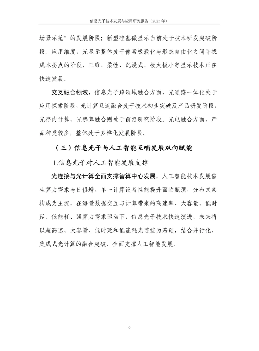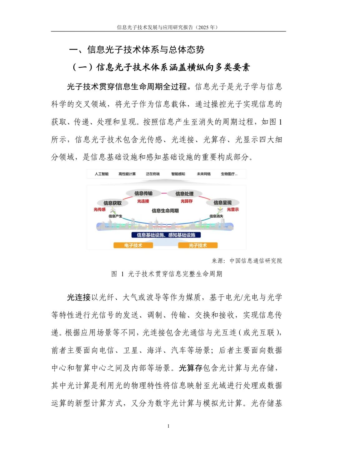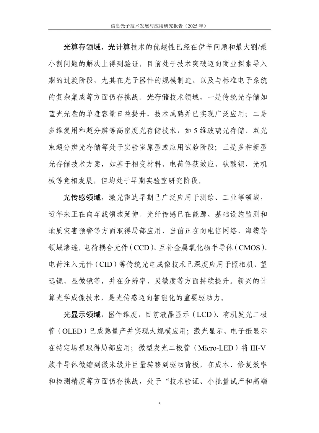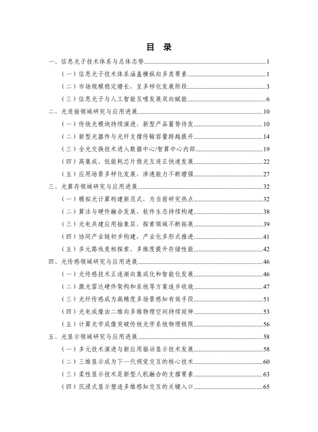信息光子技术以光子作为信息与能量的载体,广泛应用于信息获取、传输、处理及呈现,以及能量转换与释放。该技术作为推动新一轮科技革命和产业变革的关键力量,近年来在人工智能、先进计算等前沿领域展现出深度融合趋势,成为全球各国重点布局的战略方向。信息光子技术正加速发展,进入战略机遇期。需求侧与人工智能、移动通信、未来网络、生物医疗等领域的深度结合,使应用边界不断拓展,渗透力和辐射力显著增强。供给侧方面,新材料、新结构、新工艺及新机理的创新活跃,推动芯片级光互连、光交换、光计算、新型传感与显示等方向取得突破,形成算连存一体、通感一体、感显融合等新范式。光电融合成为新兴赛道,市场潜力持续释放,信息化各领域的重要性日益凸显。2024年,中国信息通信研究院首次发布相关研究报告,为行业提供了重要参考。本报告基于2025年最新动态,聚焦信息光子技术的重点细分领域和共性基础环节,探讨其研究进展、与人工智能的双向赋能、光电融合等热点问题,并展望未来发展趋势与路径,旨在推动我国信息光子技术产业高质量发展。报告涵盖多个核心领域:光连接、光算存、光传感、光显示及光子交叉融合。在光连接方面,传统光模块持续演进,新型产品蓄势待发;新型光器件与光纤提升传输容量;全光交换技术逐步应用于数据中心;高集成、低能耗的芯片级光互连快速发展;应用场景多样化,渗透能力不断增强。光算存领域中,模拟光计算构建新范式,成为研究热点;算法与硬件融合推动软件生态建设;光电共建应用抽象层,拓展应用领域;产业链初步形成,产业化形式多样;多元路线探索提升存储性能。光传感技术向集成化、智能化演进,激光雷达架构逐步收敛;光纤传感成为高精度多场景感知手段;光电成像从二维向多维空间延伸;计算光学成像突破传统物理极限。光显示领域呈现多元技术演进与新应用驱动;三维显示成为下一代视觉交互核心技术;柔性显示支撑新型人机融合;沉浸式显示塑造多维感知入口;极大极小显示技术拓展视觉边界。光子交叉融合方面,光计算、互连、存储一体化是远期目标;光网络通感一体化架构加速构建;光感算融合提升实时数据处理能力;光感显融合重新定义人机交互方式。