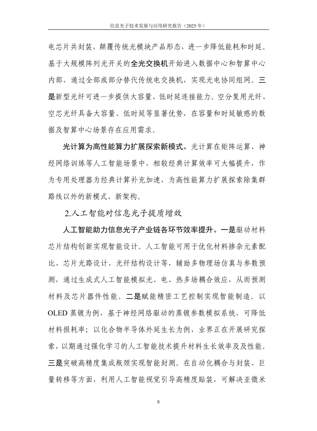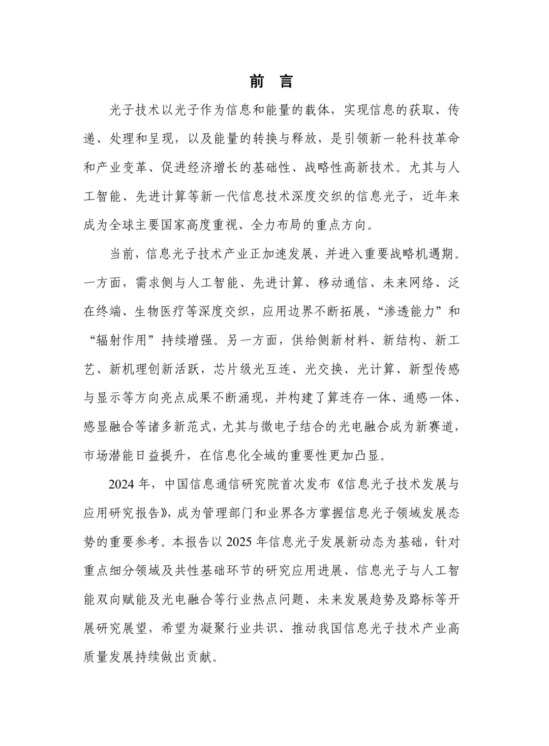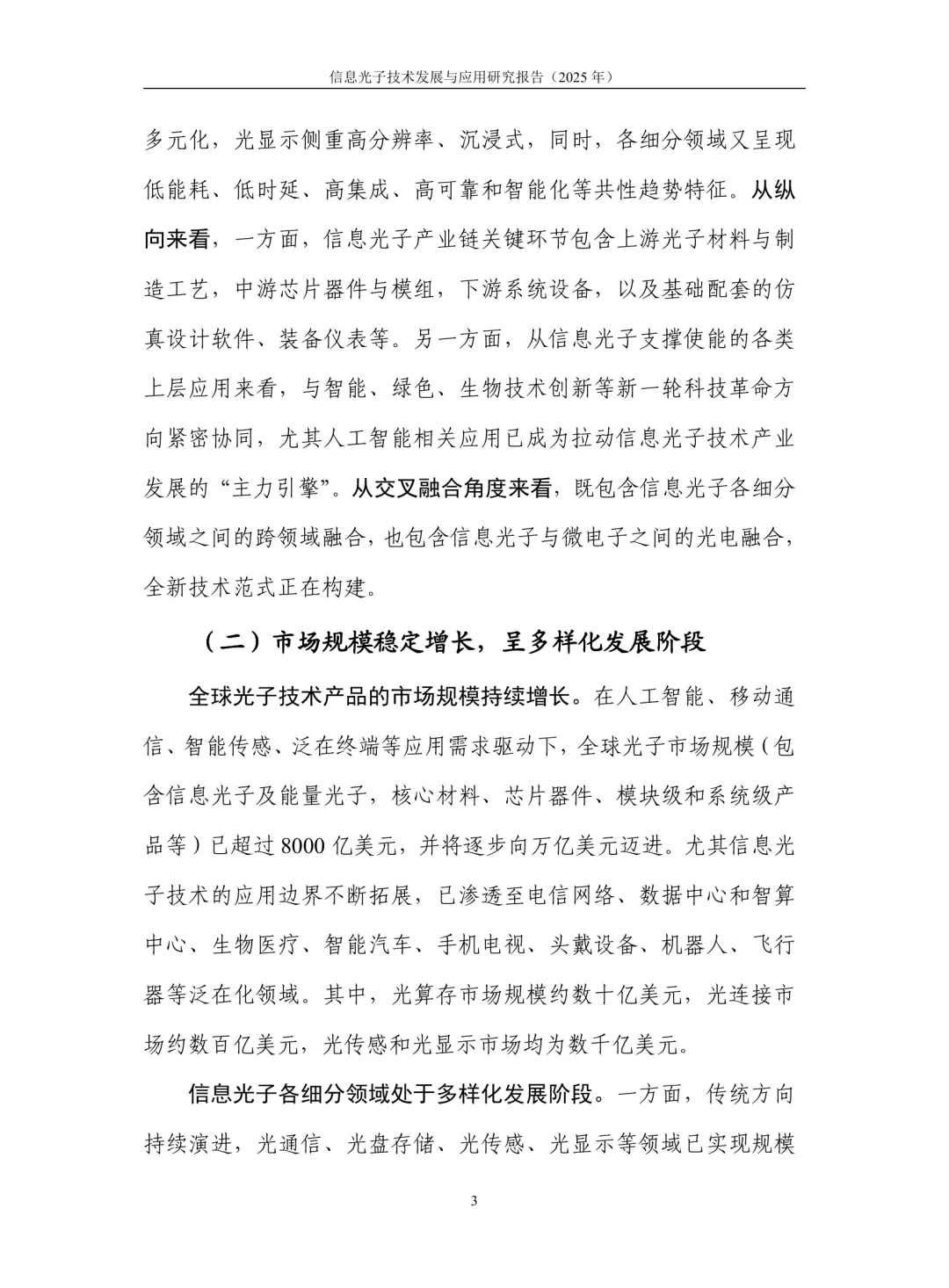 信息光子技术以光子作为信息与能量的载体,广泛应用于信息获取、传输、处理及呈现,以及能量转换与释放。该技术作为推动新一轮科技革命和产业变革的关键力量,近年来在人工智能、先进计算等前沿领域展现出深度融合趋势,成为全球各国重点布局的战略方向。信息光子技术正加速发展,进入战略机遇期。需求侧与人工智能、移动通信、未来网络、生物医疗等领域的深度结合,使应用边界不断拓展,渗透力和辐射力显著增强。供给侧方面,新材料、新结构、新工艺及新机理的创新活跃,推动芯片级光互连、光交换、光计算、新型传感与显示等方向取得突破,形成算连存一体、通感一体、感显融合等新范式。光电融合成为新兴赛道,市场潜力持续释放,信息化各领域的重要性日益凸显。2024年,中国信息通信研究院首次发布相关研究报告,为行业提供了重要参考。本报告基于2025年最新动态,聚焦信息光子技术的重点细分领域和共性基础环节,探讨其研究进展、与人工智能的双向赋能、光电融合等热点问题,并展望未来发展趋势与路径,旨在推动我国信息光子技术产业高质量发展。报告涵盖多个核心领域:光连接、光算存、光传感、光显示及光子交叉融合。在光连接方面,传统光模块持续演进,新型产品蓄势待发;新型光器件与光纤提升传输容量;全光交换技术逐步应用于数据中心;高集成、低能耗的芯片级光互连快速发展;应用场景多样化,渗透能力不断增强。光算存领域中,模拟光计算构建新范式,成为研究热点;算法与硬件融合推动软件生态建设;光电共建应用抽象层,拓展应用领域;产业链初步形成,产业化形式多样;多元路线探索提升存储性能。光传感技术向集成化、智能化演进,激光雷达架构逐步收敛;光纤传感成为高精度多场景感知手段;光电成像从二维向多维空间延伸;计算光学成像突破传统物理极限。光显示领域呈现多元技术演进与新应用驱动;三维显示成为下一代视觉交互核心技术;柔性显示支撑新型人机融合;沉浸式显示塑造多维感知入口;极大极小显示技术拓展视觉边界。光子交叉融合方面,光计算、互连、存储一体化是远期目标;光网络通感一体化架构加速构建;光感算融合提升实时数据处理能力;光感显融合重新定义人机交互方式。