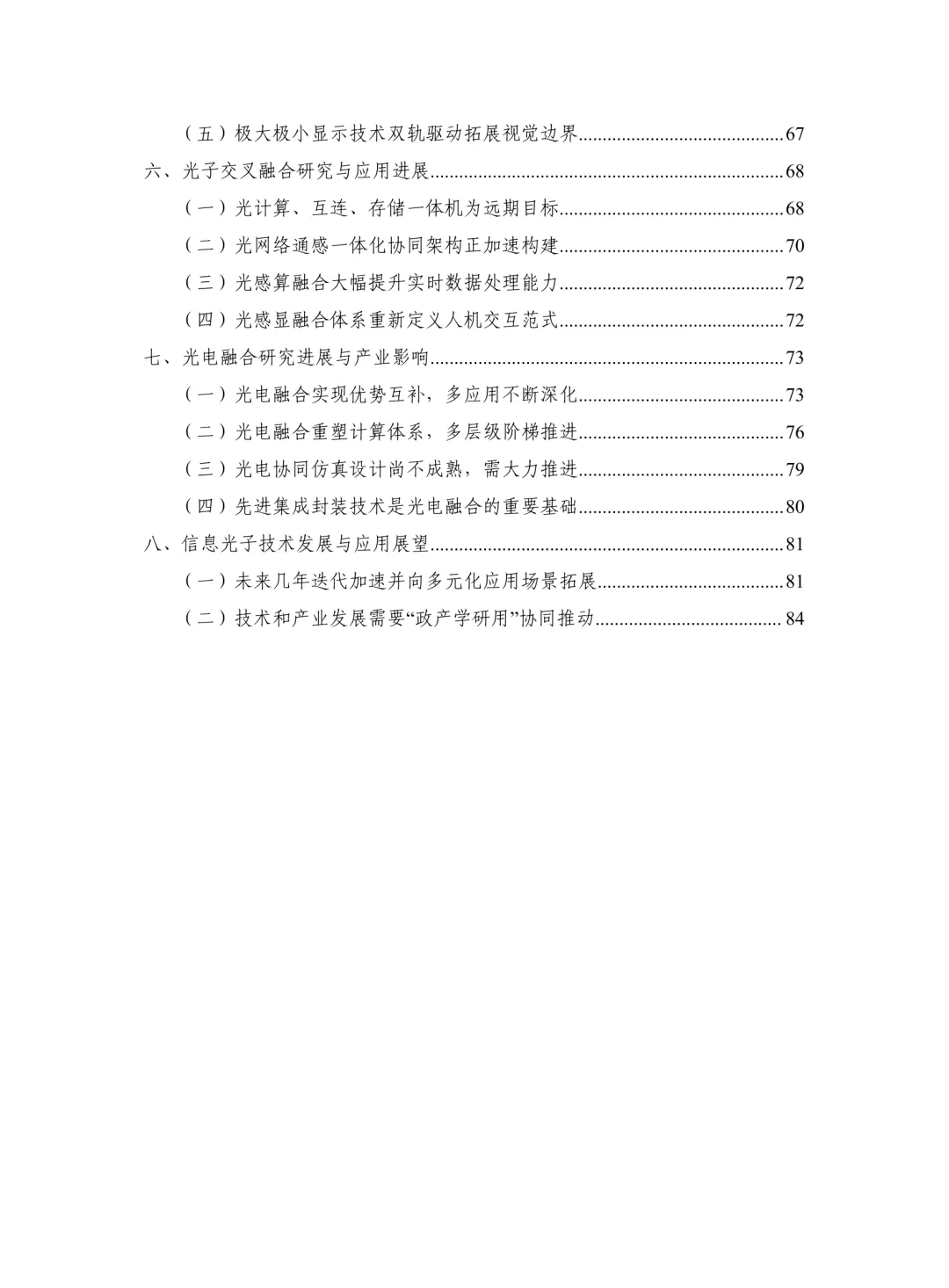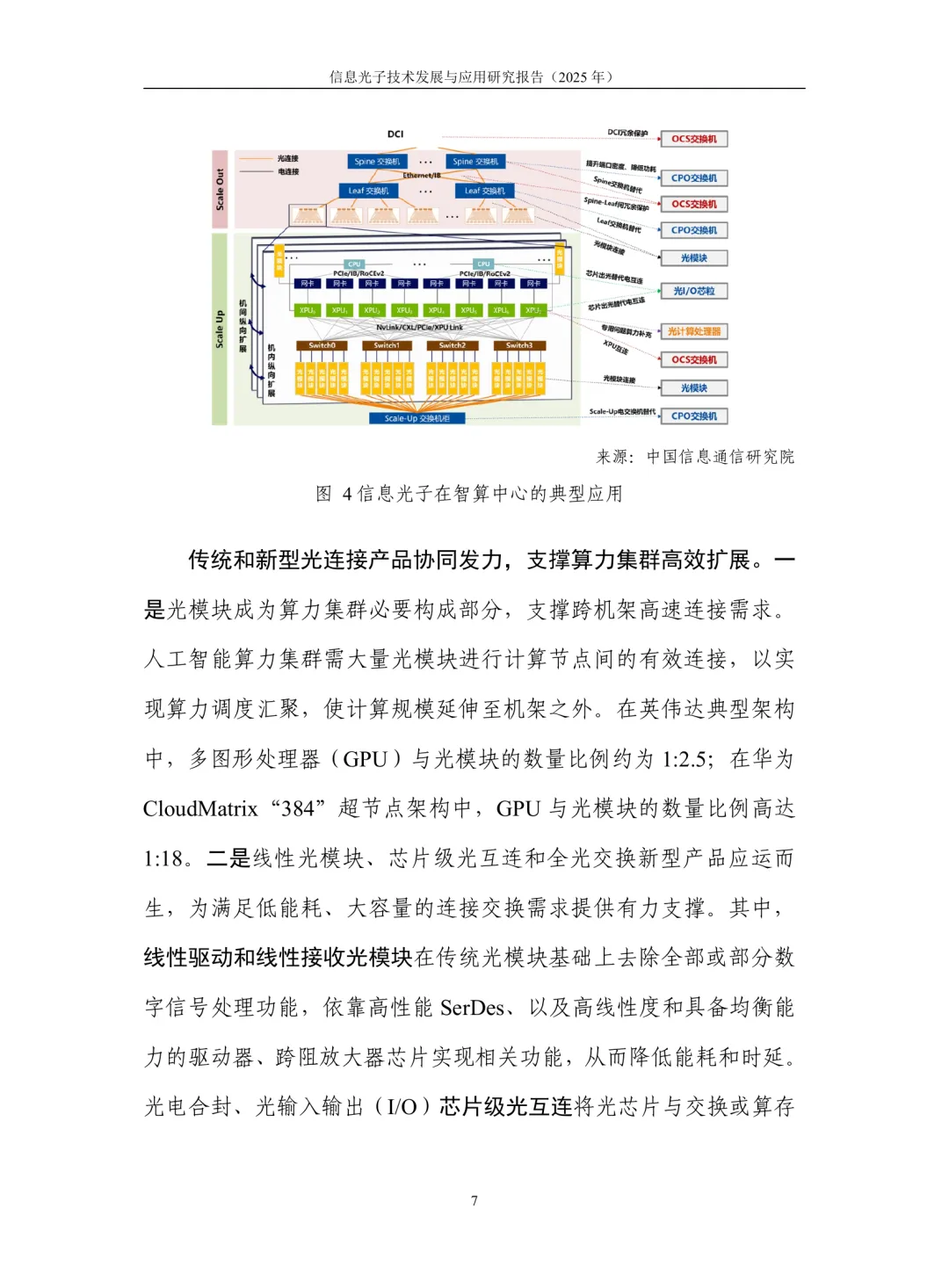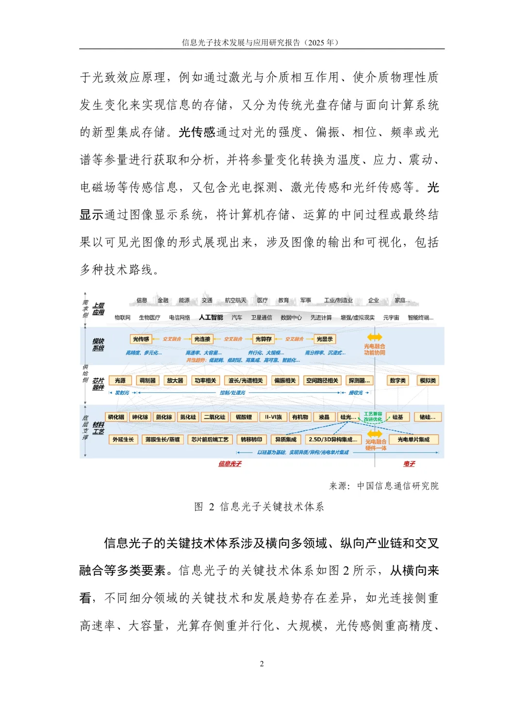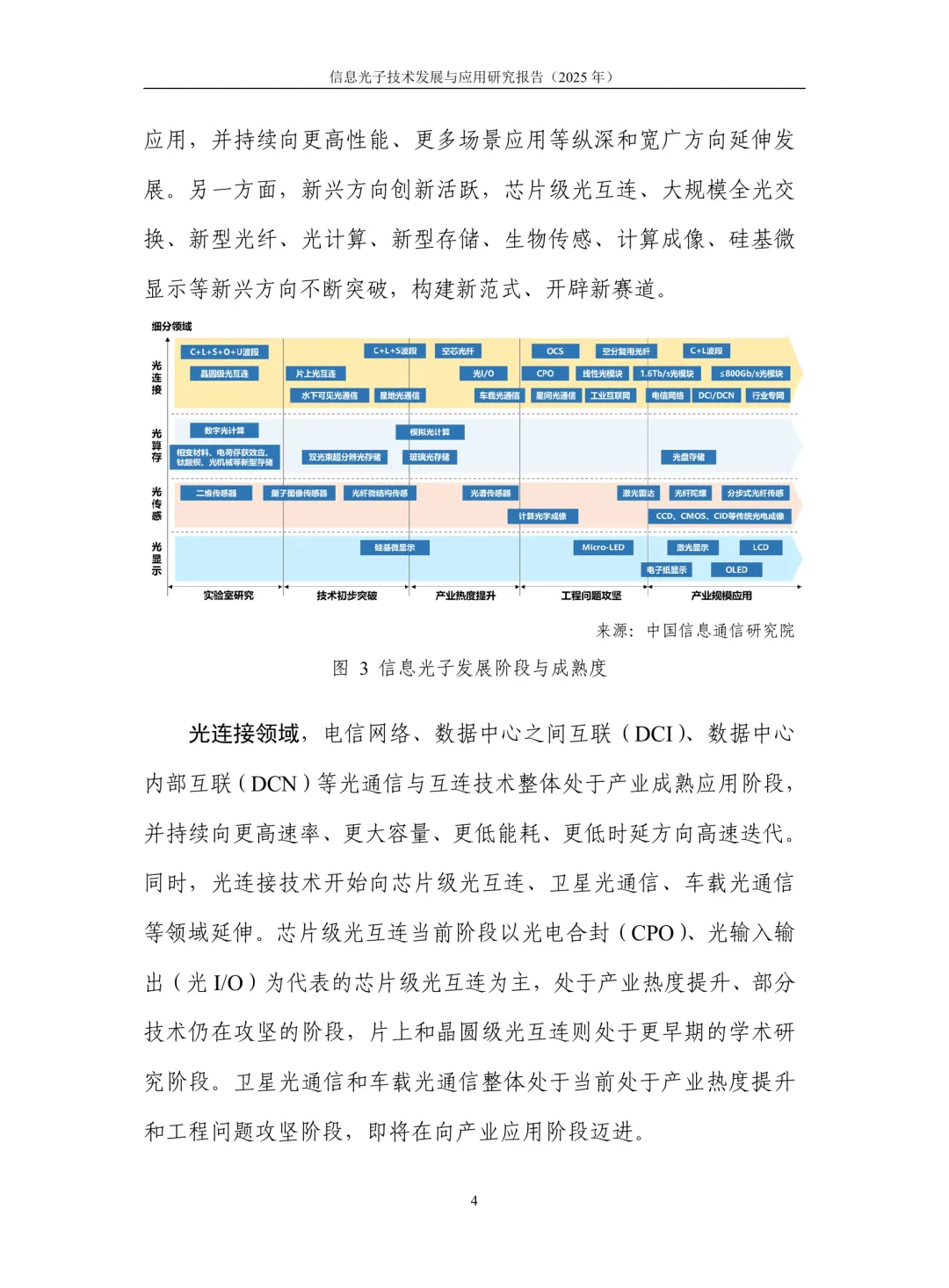 信息光子技术以光子作为信息与能量的载体,广泛应用于信息获取、传输、处理及呈现,以及能量转换与释放。该技术作为推动新一轮科技革命和产业变革的关键力量,近年来在人工智能、先进计算等前沿领域展现出深度融合趋势,成为全球各国重点布局的战略方向。信息光子技术正加速发展,进入战略机遇期。需求侧与人工智能、移动通信、未来网络、生物医疗等领域的深度结合,使应用边界不断拓展,渗透力和辐射力显著增强。供给侧方面,新材料、新结构、新工艺及新机理的创新活跃,推动芯片级光互连、光交换、光计算、新型传感与显示等方向取得突破,形成算连存一体、通感一体、感显融合等新范式。光电融合成为新兴赛道,市场潜力持续释放,信息化各领域的重要性日益凸显。2024年,中国信息通信研究院首次发布相关研究报告,为行业提供了重要参考。本报告基于2025年最新动态,聚焦信息光子技术的重点细分领域和共性基础环节,探讨其研究进展、与人工智能的双向赋能、光电融合等热点问题,并展望未来发展趋势与路径,旨在推动我国信息光子技术产业高质量发展。报告涵盖多个核心领域:光连接、光算存、光传感、光显示及光子交叉融合。在光连接方面,传统光模块持续演进,新型产品蓄势待发;新型光器件与光纤提升传输容量;全光交换技术逐步应用于数据中心;高集成、低能耗的芯片级光互连快速发展;应用场景多样化,渗透能力不断增强。光算存领域中,模拟光计算构建新范式,成为研究热点;算法与硬件融合推动软件生态建设;光电共建应用抽象层,拓展应用领域;产业链初步形成,产业化形式多样;多元路线探索提升存储性能。光传感技术向集成化、智能化演进,激光雷达架构逐步收敛;光纤传感成为高精度多场景感知手段;光电成像从二维向多维空间延伸;计算光学成像突破传统物理极限。光显示领域呈现多元技术演进与新应用驱动;三维显示成为下一代视觉交互核心技术;柔性显示支撑新型人机融合;沉浸式显示塑造多维感知入口;极大极小显示技术拓展视觉边界。光子交叉融合方面,光计算、互连、存储一体化是远期目标;光网络通感一体化架构加速构建;光感算融合提升实时数据处理能力;光感显融合重新定义人机交互方式。