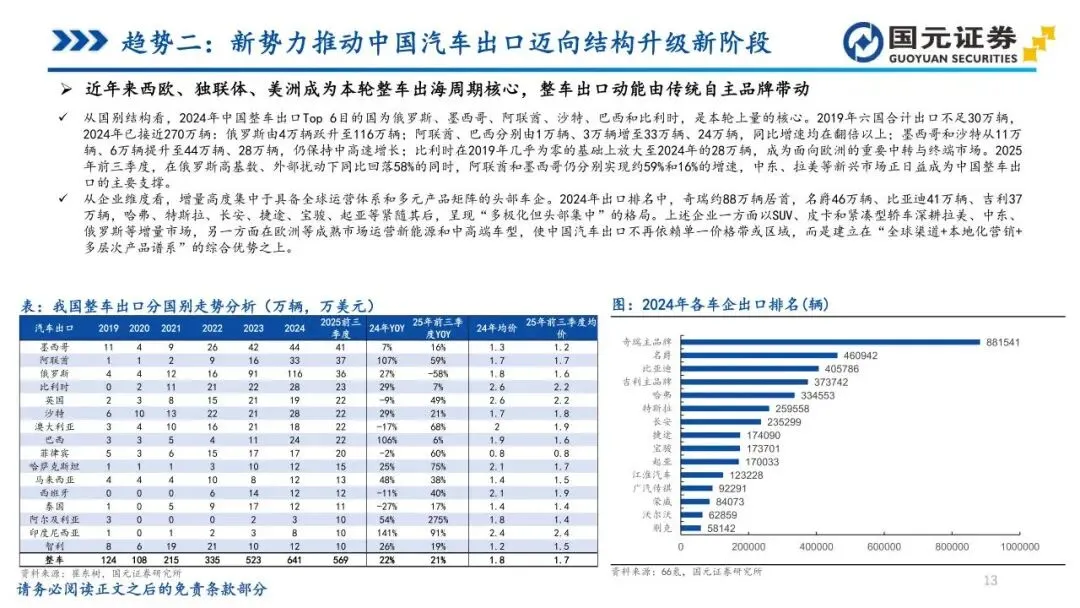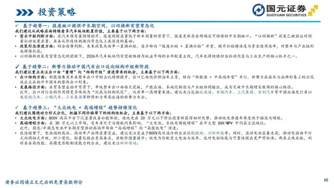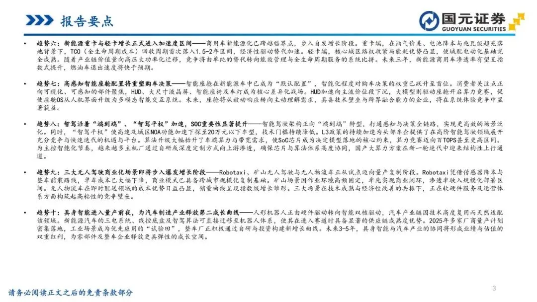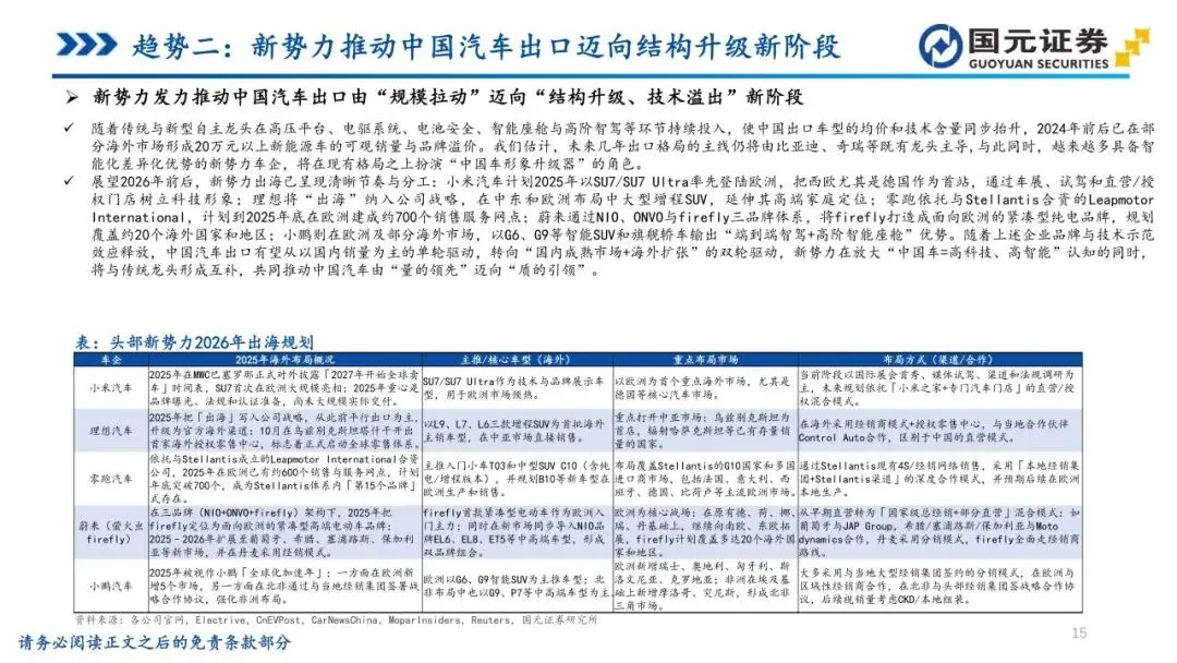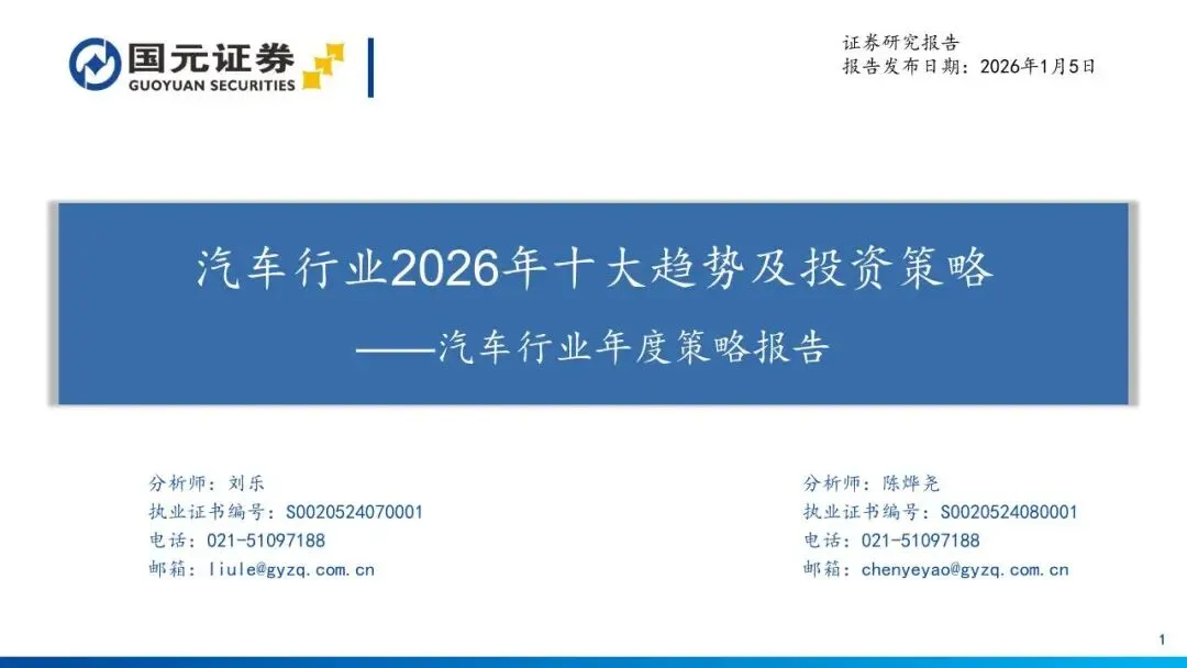本报告摘自国元证券2026年1月5日已发布的《汽车行业2026年十大趋势及投资策略——汽车行业年度策略报告》,具体报告及分析内容请详见报告。若因对报告的摘编等产生歧义,应以报告发布当日的完整内容为准。