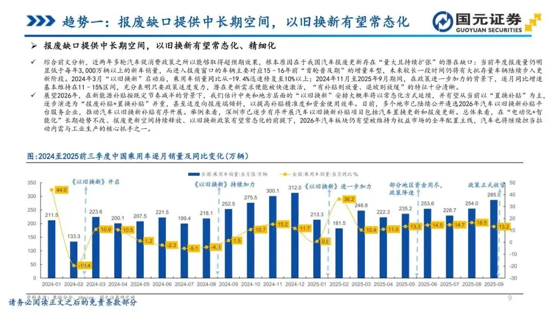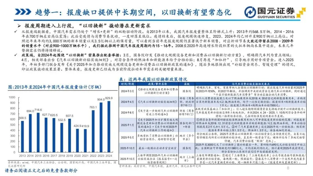 基于趋势一:报废缺口提供中长期空间,以旧换新有望常态化——建议持续看多汽车板块,关注因“以旧换新”政策常态化带来的长期市场需求,特别是整车制造商与产业链上下游相关企业。