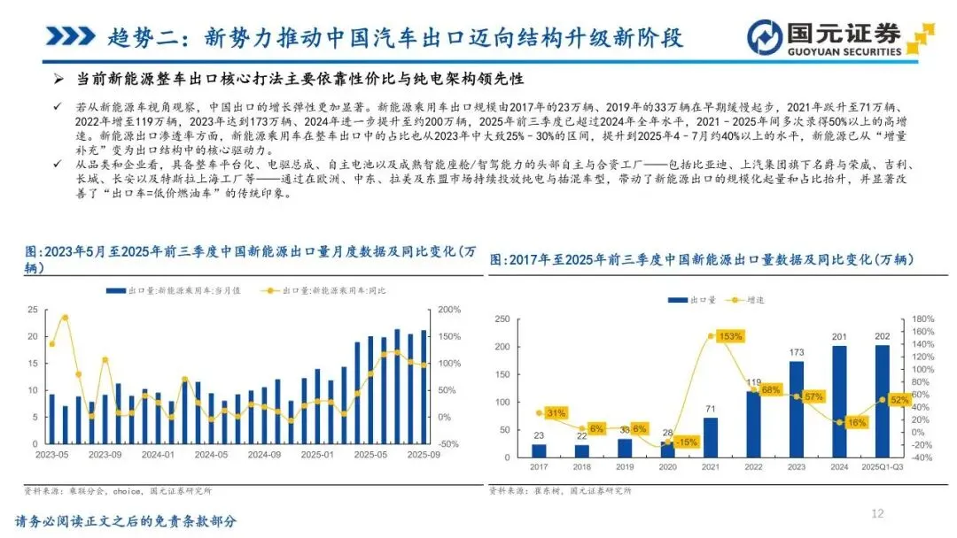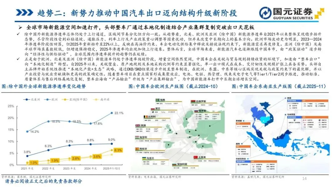 趋势二:新势力推动中国汽车出口迈向结构升级新阶段——中国汽车出口进入高增长阶段,四年间实现数倍增长,逐步成为“第二增长曲线”。出口结构经历深刻变革,新能源渗透率显著提升,新势力车企通过高价值产品输出,显著提升了中国汽车在全球市场的品牌溢价与科技形象。面对关税与贸易规则收紧,车企从单一整车出口转向本地化产能布局,通过“产业集群输出”突破增长瓶颈。2026年前后,内外双轮驱动将助力中国汽车由量的领先迈向质的引领。