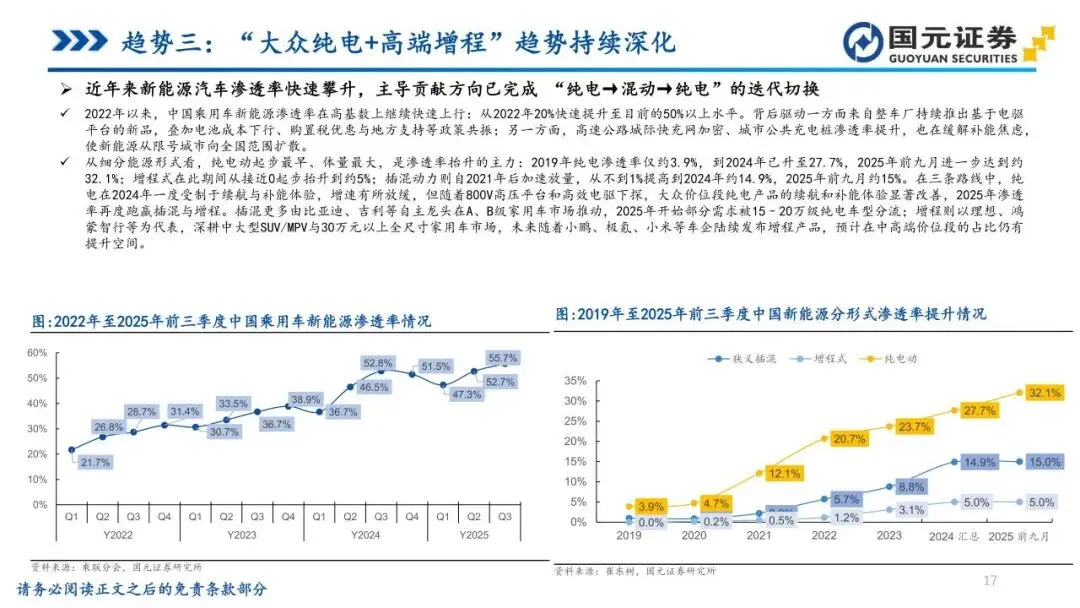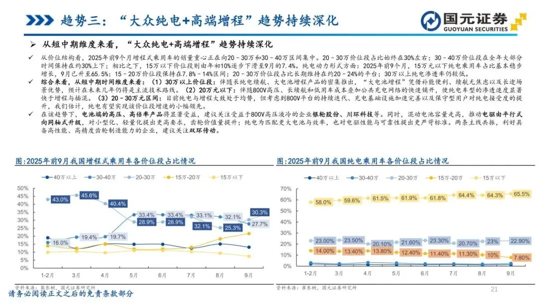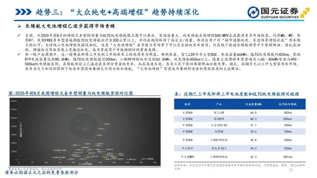 趋势三:“大众纯电+高端增程”趋势持续深化——新能源渗透率突破50%后,市场需求出现结构性分化。在20万元以下大众市场,800V高压平台的下沉显著改善了补能效率,推动纯电增速反超插混与增程。在30万元以上市场,受续航与补能便利性驱动,“大电池长续航增程”因能兼顾城市纯电通勤与长途无焦虑,依然是全尺寸SUV/MPV的主流解法。中长期看,固态/半固态电池的成熟有望攻克纯电续航瓶颈,实现高端市场从“高端增程”向“高能纯电”的结构跃迁。