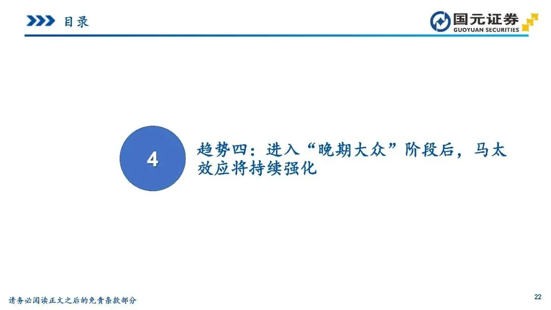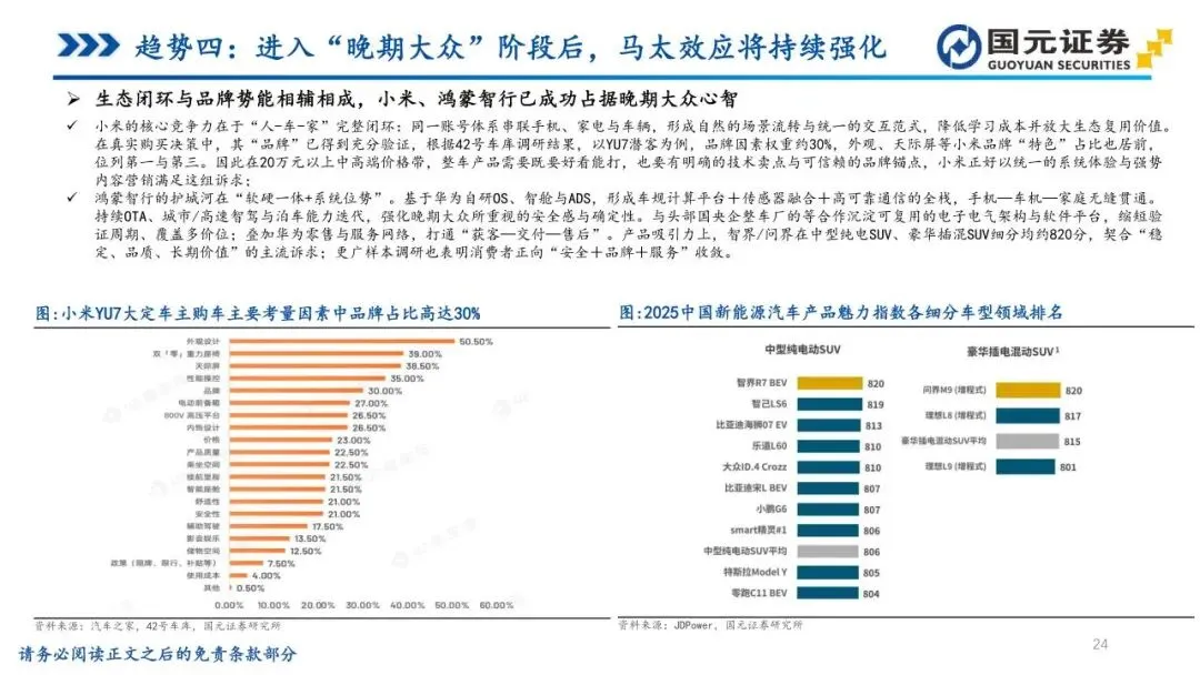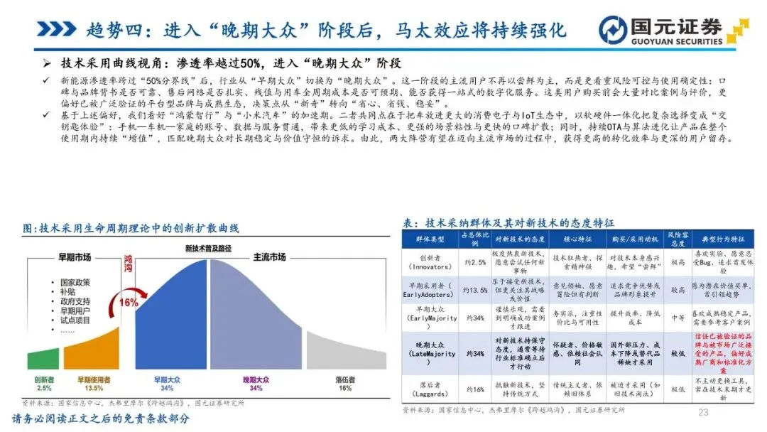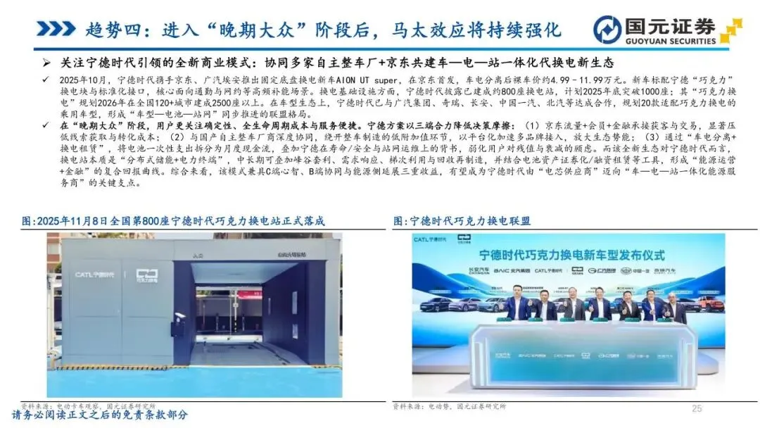 趋势四:进入“晚期大众”阶段后,马太效应将持续强化——行业正从“早期大众”向“晚期大众”阶段切换,用户不再单纯尝鲜,而是看重品牌背书、售后保障及残值确定性。这类务实派用户偏好成熟品牌与生态闭环,“人-车-家”协同能力正成为核心竞争力。市场资源加速向头部科技阵营收敛,通过软件一体化与持续OTA降低决策摩擦。同时,行业涌现出“车-电-站”一体化的能源运营模式,通过车电分离弱化衰减顾虑,马太效应将使具备体系优势的龙头在主流价位段获得更高转化效率。