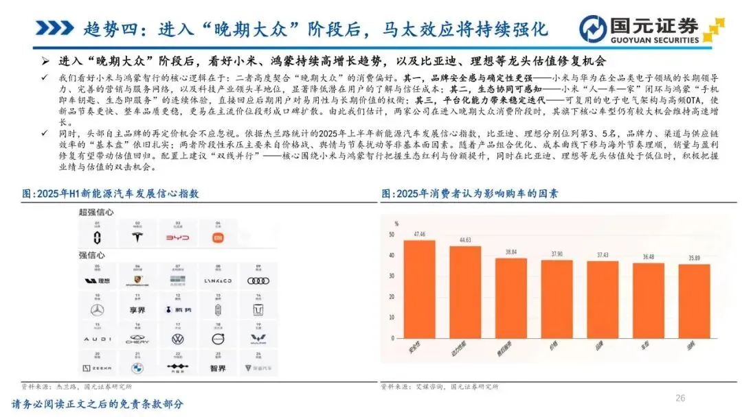 基于趋势四:进入“晚期大众”阶段后,马太效应将持续强化——关注具备软硬件一体化生态协同能力的企业,如小米集团与鸿蒙智行,并在比亚迪、理想等龙头估值较低时把握业绩与估值的双重机会。