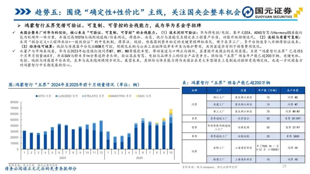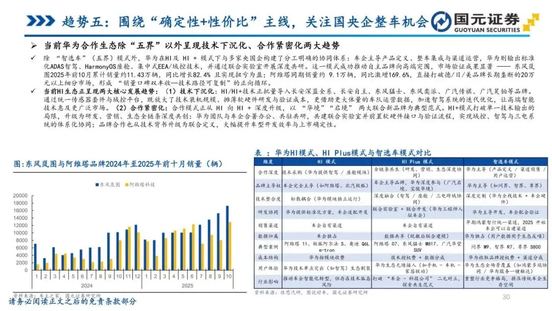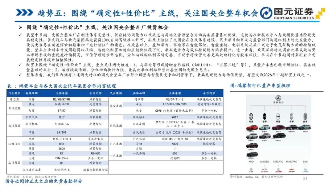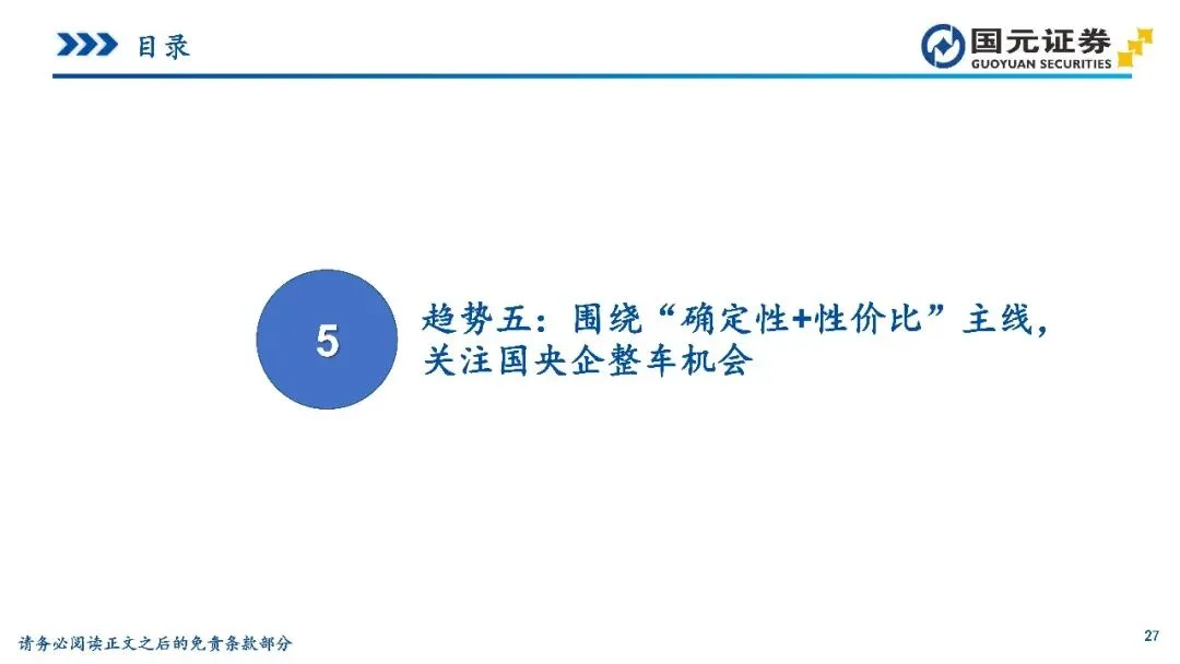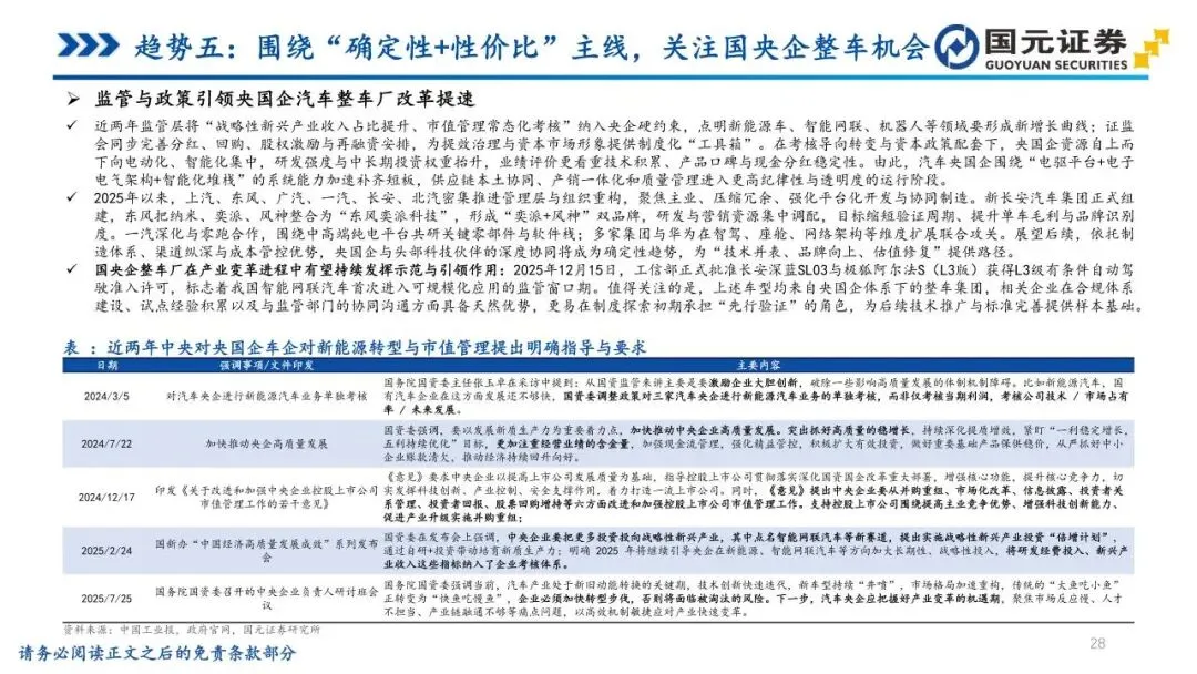 趋势五:围绕“确定性+性价比”主线,关注国央企整车机会——监管层强化央企新能源业务单独考核与市值管理,驱动国央企资源向电动智能化加速集中。各大汽车集团密集推进组织重构,通过赋能合作缩短开发周期,使智能化配置加速向主销价位段下沉。国央企在制造体系、渠道纵深及合规准入试点方面具备天然优势,尤其在L3级自动驾驶准入等领域占据先发身位。通过管理治理提效与分红回购机制完善,经营改善正更高效地传导至市场回报,为技术向上与品牌修复提供了稳固的确定性支撑。
