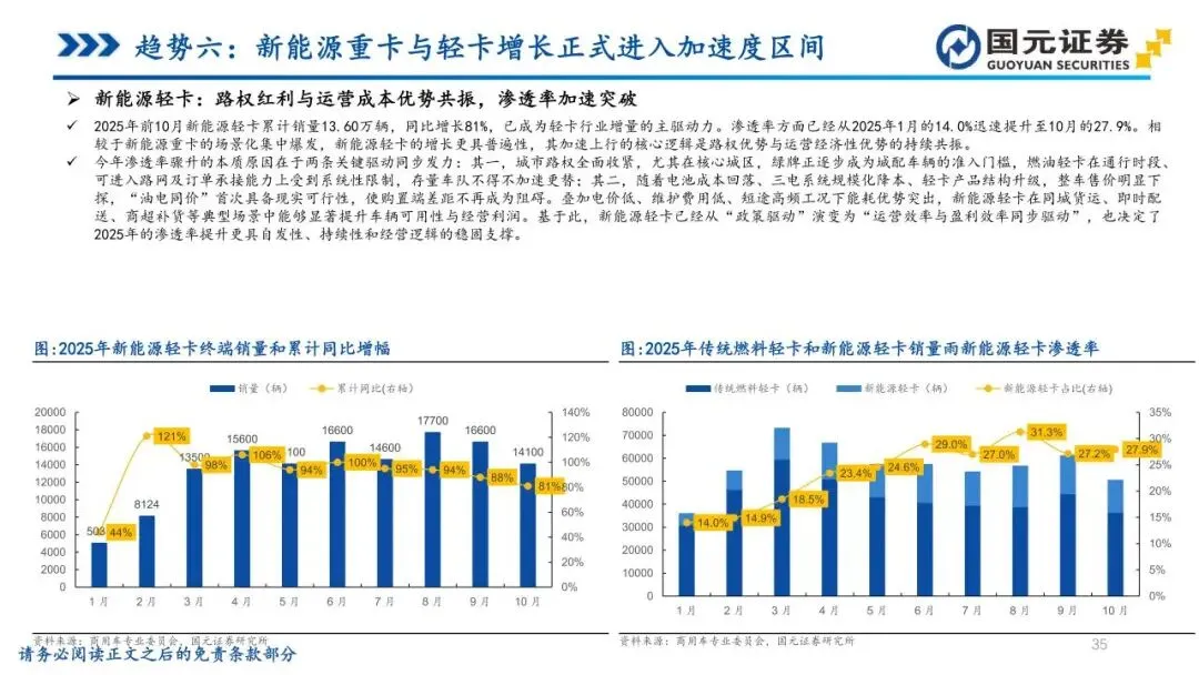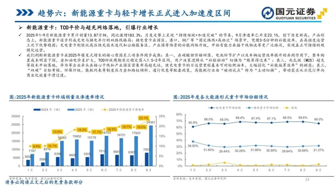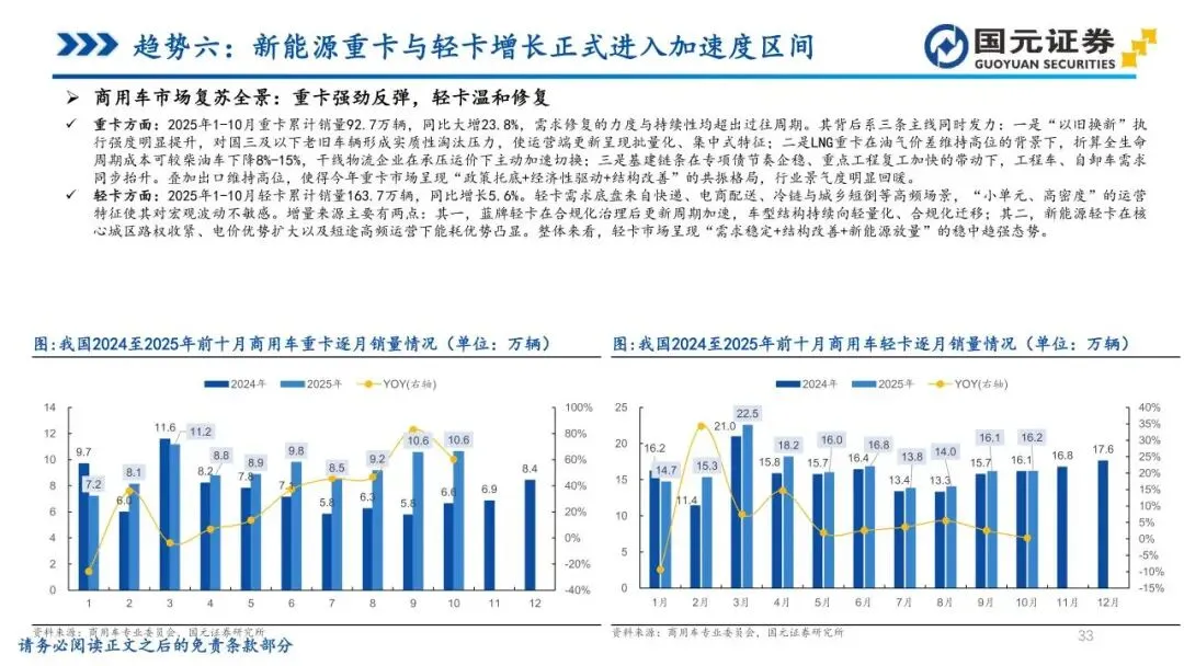 趋势六:新能源重卡与轻卡增长正式进入加速度区间——商用车新能源化已跨越临界点,步入自发增长阶段。重卡端,在油气价差、电池降本与兆瓦级超充落地背景下,TCO(全生命周期成本)回收周期首次落入1.5-2年区间,经济性驱动替代加速。轻卡端,核心城区路权收紧与能耗优势凸显,使城配电动化基础完全成熟。随着产业链价值量向高压大功率化迁移,竞争将由单纯的替代转向能效管理与全生命周期服务的系统比拼。未来三年,新能源商用车渗透率有望呈指数式提升,燃油车退出速度将快于预期。