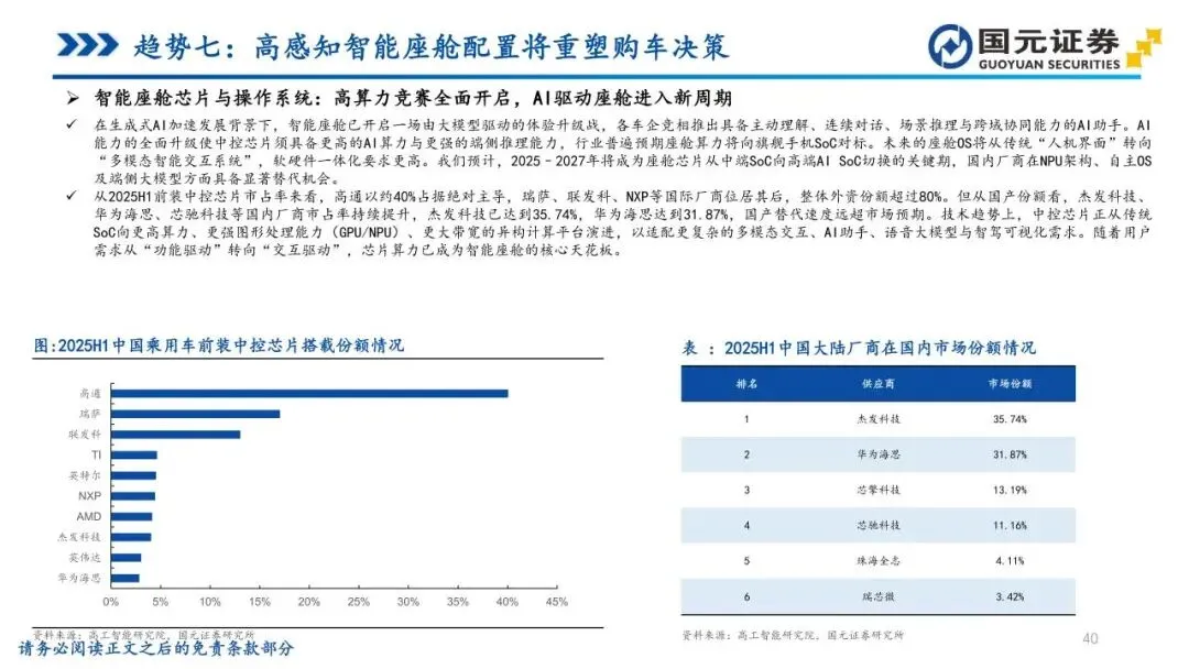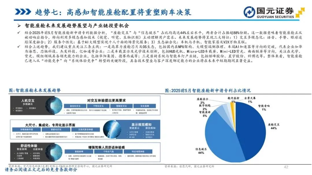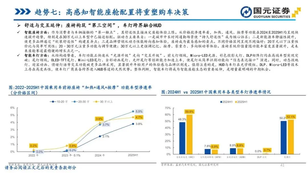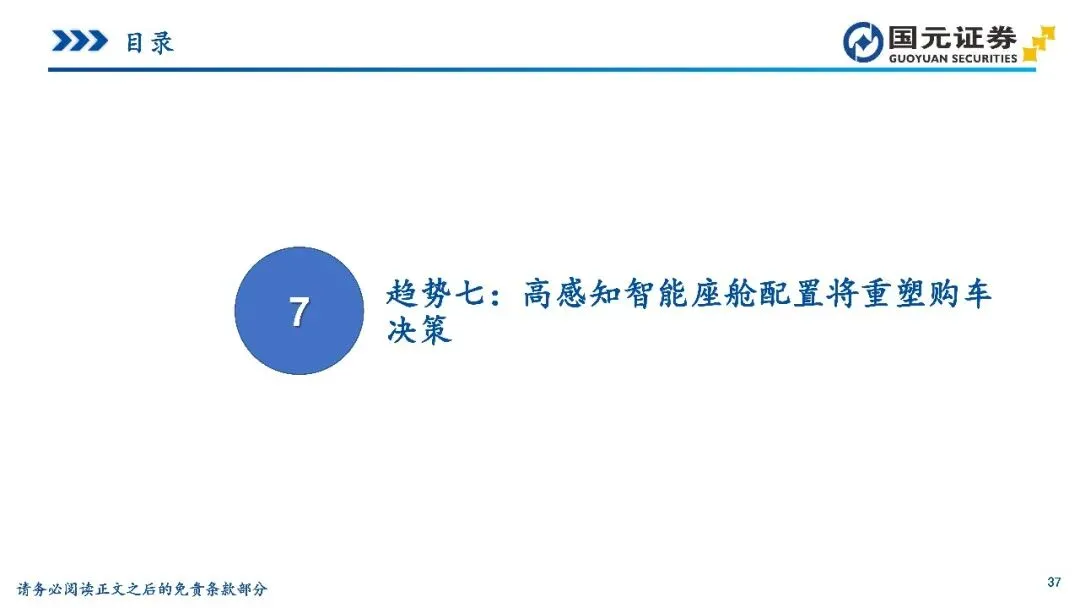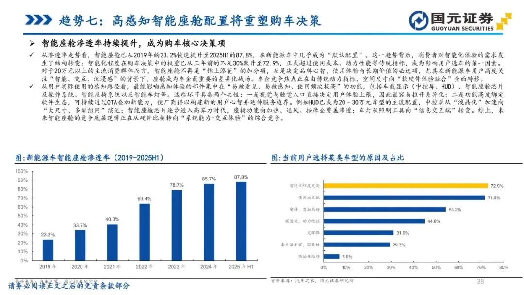趋势七:高感知智能座舱配置将重塑购车决策——智能座舱在新能源车中已成为“默认配置”,智能化程度对购车决策的权重已跃升至首位。消费者关注点正向可视化、可感知的部件聚焦,HUD、大尺寸液晶屏、智能座椅及车灯成为核心差异化战场。HUD加速向主流价位段下沉,大模型则驱动座舱开启算力竞赛,促使座舱OS从人机界面升级为多模态智能交互系统。未来,座舱将从被动响应转向主动理解需求,具备技术壁垒与跨界融合能力的企业,将在系统体验竞争中显著获益。