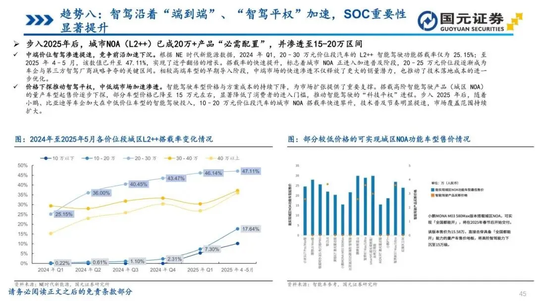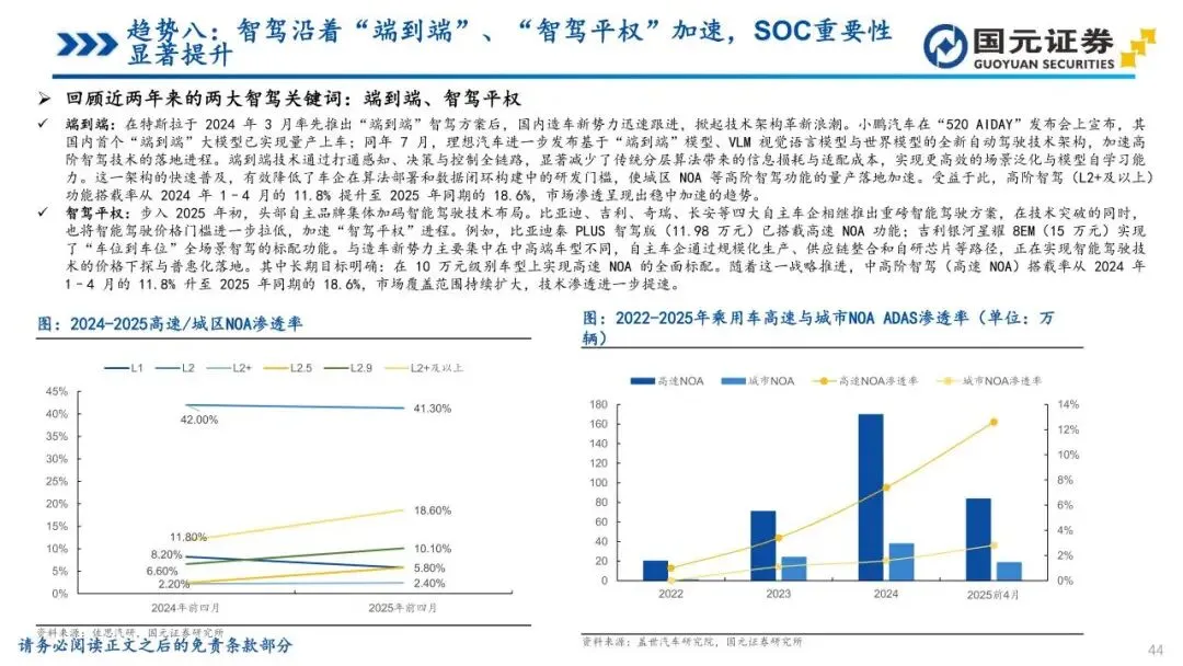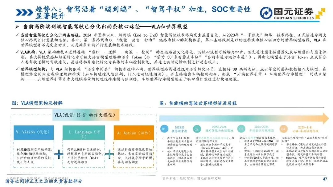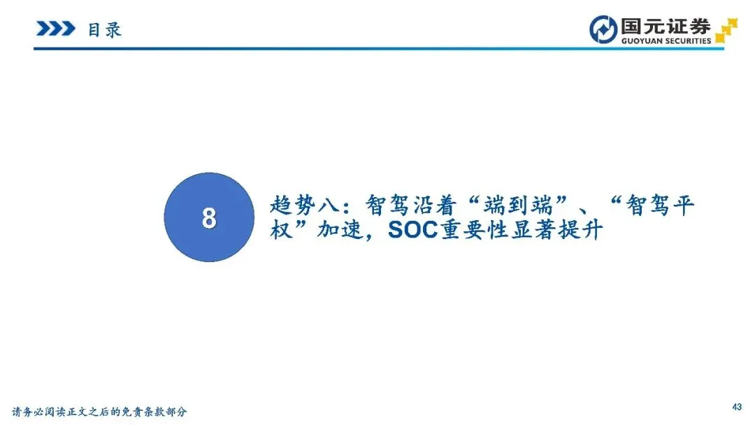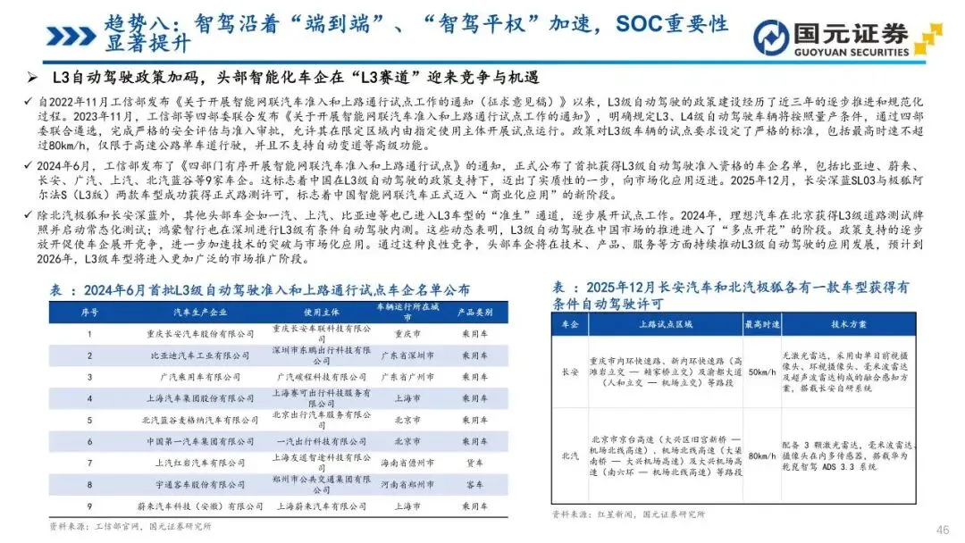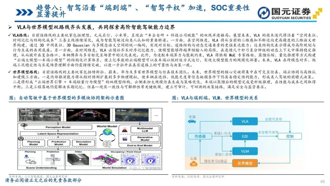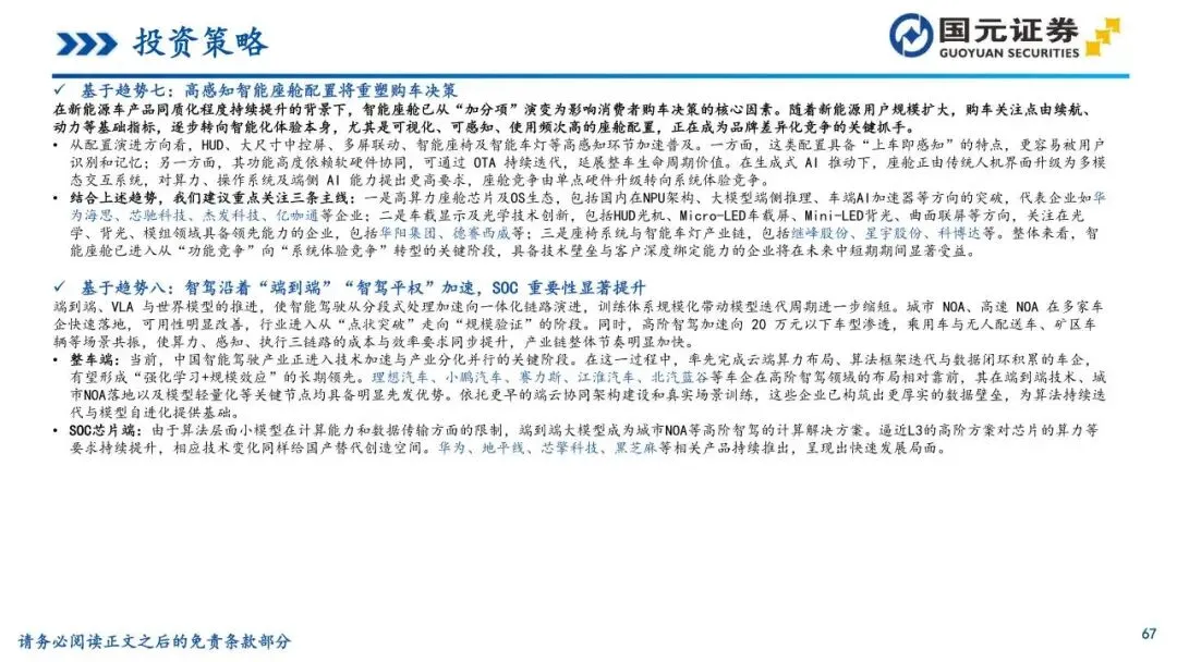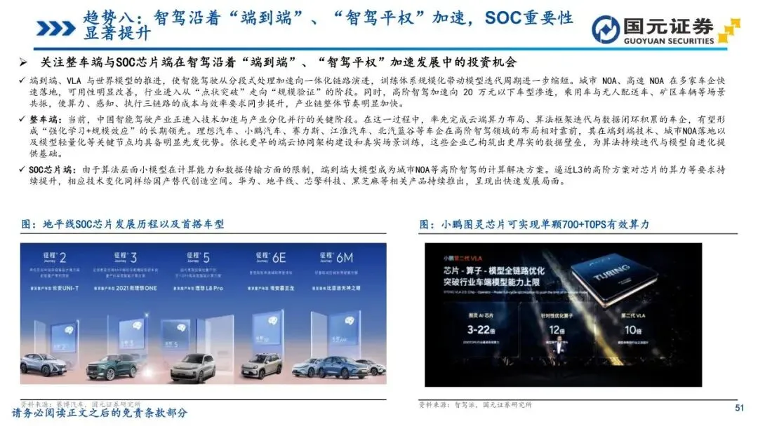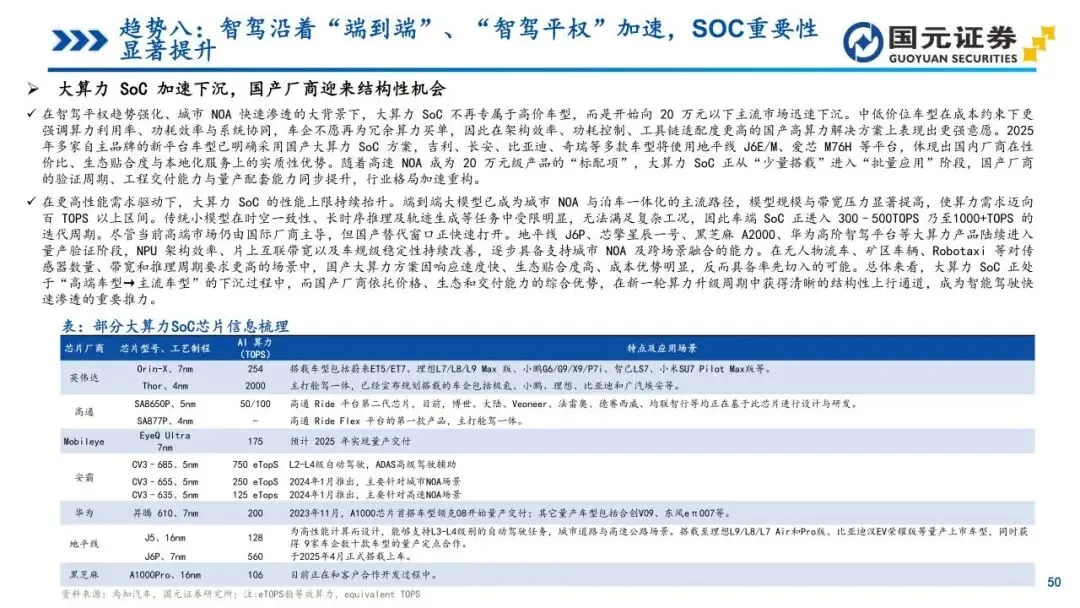 趋势八:智驾沿着“端到端”、“智驾平权”加速,SOC重要性显著提升——智能驾驶架构正向“端到端”转型,打通感知与决策全链路,实现更高效的场景泛化。同时,“智驾平权”使高速及城区NOA功能加速下探至20万元以下车型,技术门槛持续降低。L3政策的持续加速为头部车企提供了在高阶智能驾驶领域展开充分竞争与快速迭代的机遇与平台。算法升级大幅抬升了车端算力与带宽需求,使SoC芯片成为决定模型落地的核心约束,算力竞赛迈向百TOPS甚至更高区间。为主控智能化节奏,越来越多主机厂通过自研或深度定制方式向上游渗透,确保芯片与算法体系高度协同,国产大算力方案在新一轮迭代中迎来结构性上行通道。