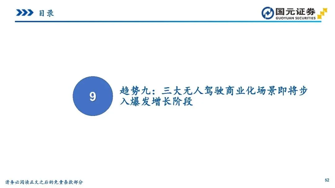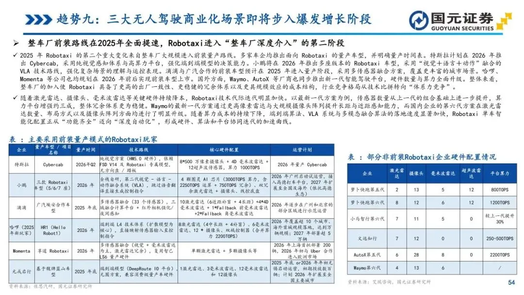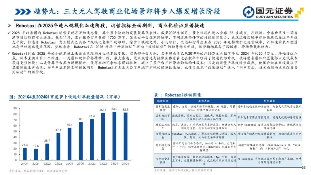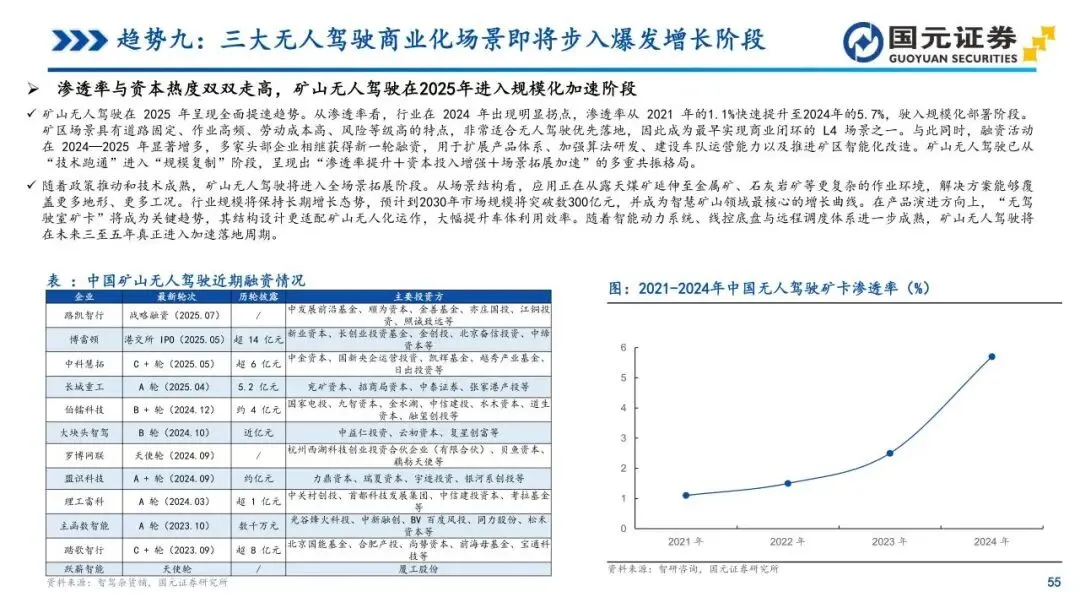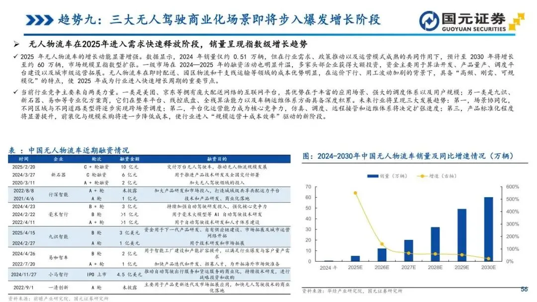趋势九:三大无人驾驶商业化场景即将步入爆发增长阶段——Robotaxi、矿山无人驾驶与无人物流车正从试点迈向量产复制阶段。Robotaxi凭借传感器降本与整车前装路线,单车成本已大幅下降,商业模式已具备跨城市规模化复制基础。矿山场景因作业环境高频固定,率先实现商业闭环,渗透率驶入规模化部署区间。无人物流车在即时配送领域的成本优势日益凸显,销量曲线呈现指数级增长雏形。三大场景在技术成熟与经济性改善的共振下,正在软硬件服务及运营体系方面构筑起高粘性的竞争壁垒。
