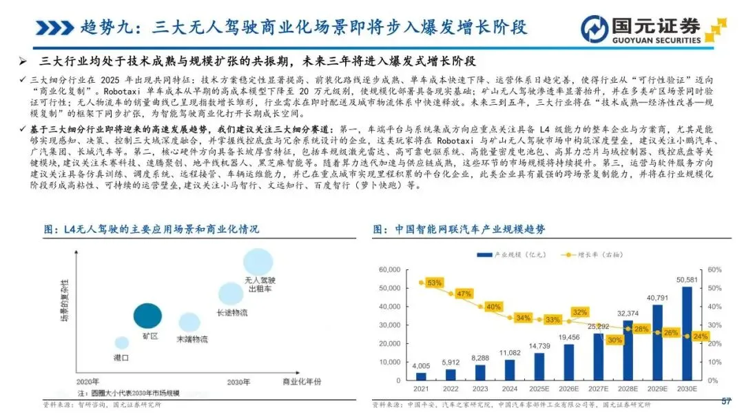基于趋势九:三大无人驾驶商业化场景即将步入爆发增长阶段——关注Robotaxi、矿山无人驾驶与无人物流车的快速扩展,重点关注具备L4级能力的整车企业与核心硬件企业,如小鹏汽车、广汽集团、禾赛科技等。