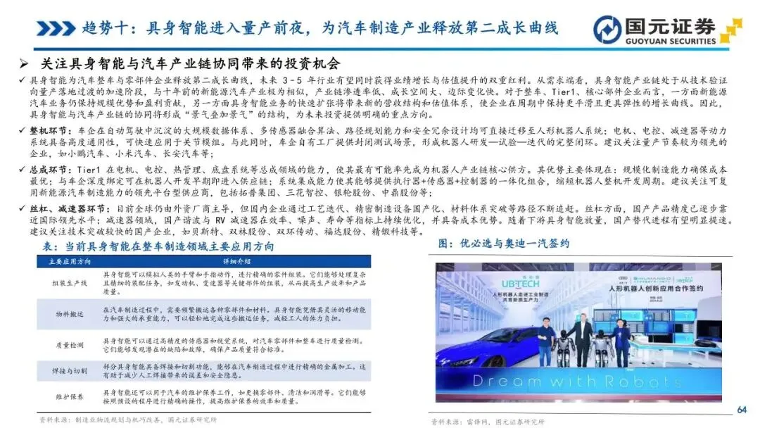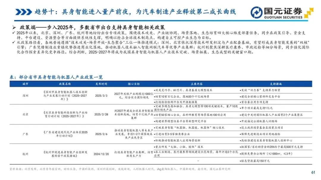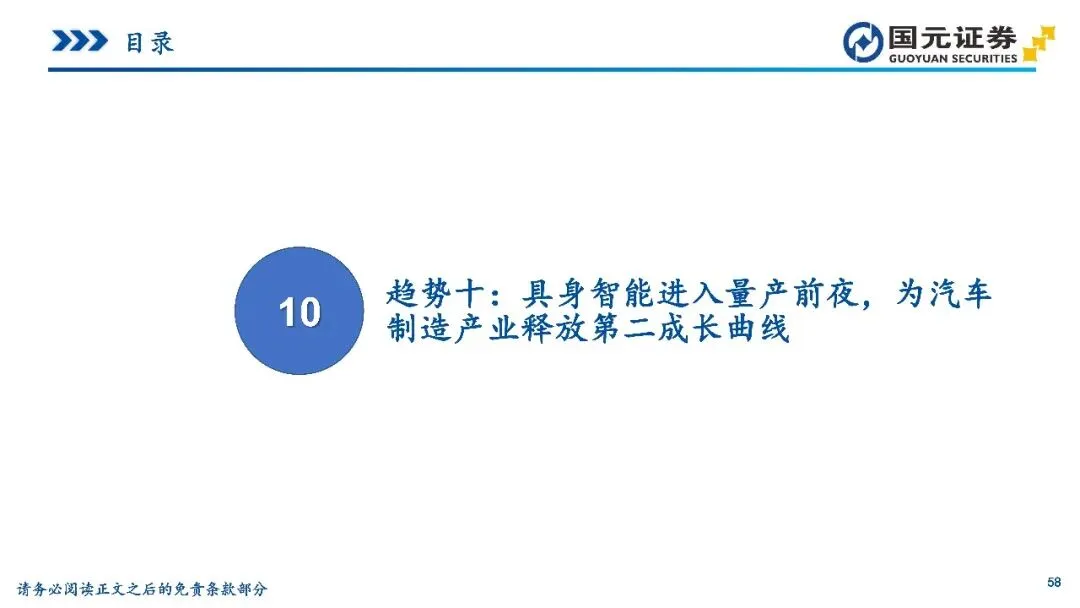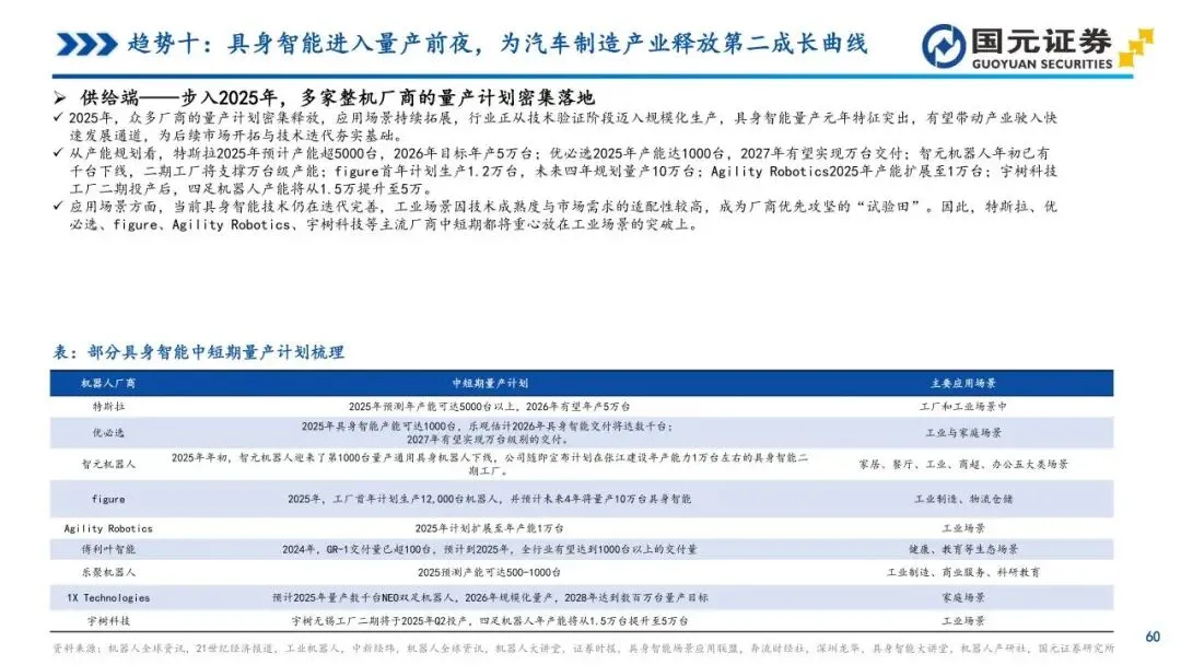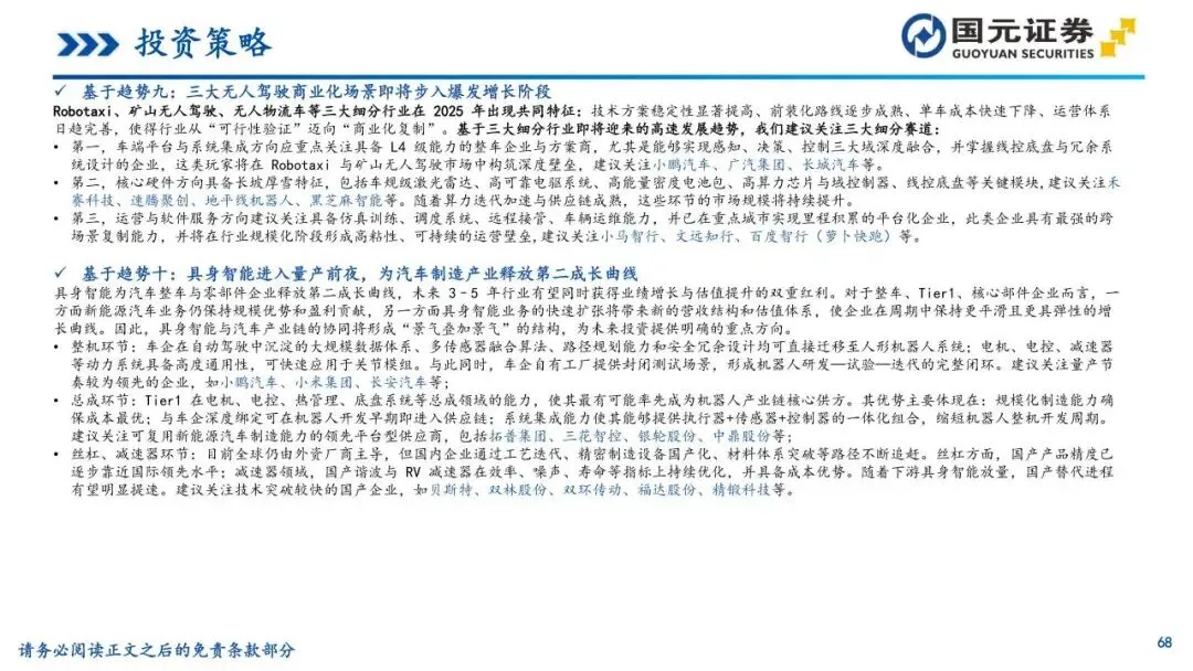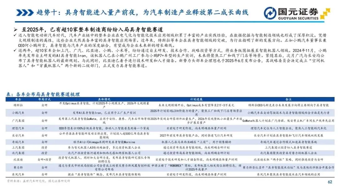 趋势十:具身智能进入量产前夜,为汽车制造产业释放第二成长曲线——人形机器人正由硬件驱动转向智能双核驱动,汽车产业链因技术高度复用而天然适配该领域。新能源汽车的三电系统、线控底盘及智驾算法可直接迁移至机器人体系,使其在进入赛道时具备显著的供应链成熟度优势。2025年多家厂商量产计划密集落地,工业场景成为优先应用的“试验田”,整车厂正积极通过自研与投资构建新增长曲线。未来3-5年,具身智能与汽车产业的协同将形成业绩与估值的双重红利,为零部件及整车企业释放更具弹性的成长空间。