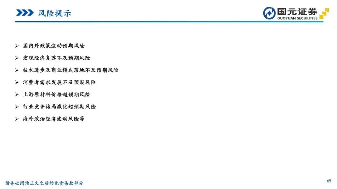 国内外政策波动预期风险,宏观经济复苏不及预期风险,技术进步及商业模式落地不及预期风险,消费者需求发展不及预期风险,上游原材料价格超预期风险,行