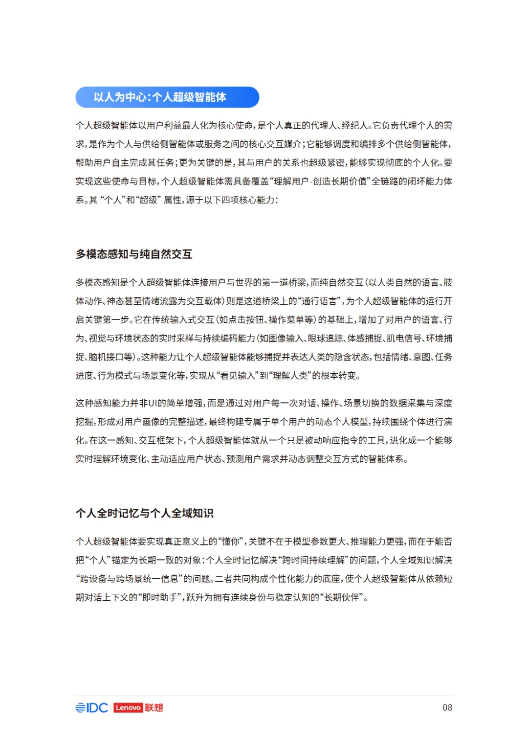 本篇行业报告可以通过扫下方知识星球下载。39元就可以下载星球所有报告。免费提供报告查找服务。在数字化时代,人工智能(AI)的发展正引领着产业价值的深刻变革。从工具价值到服务价值的转变,AI产业正经历着一场由个人超级智能体驱动的革命。个人AI时代的核心,是将AI工具的存量替代转变为通过持续服务创造增量市场的新逻辑。个人超级智能体,作为AI产业的新锚点,不仅承接人的部分行动链路,还通过持续的感知、决策与执行,创造出原本不存在的智能服务供给。这种服务型AI Agent的市场扩张速度远超传统工具型AI应用,推动着企业和个人的数字化转型。据IDC中国AI Agent市场洞察,2024年中国AI Agent市场规模约为50亿元人民币,预计到2028年将达到270亿美元,年复合增长率超过60%。在这一转型中,个人AI产业的结构和角色也在发生变化。产业结构从以平台为中心的高度集中,转变为围绕用户的多层协同的同心圆体系。个人超级智能体、个人AI终端与可信个人云构成了产业的整合层,而服务层和能力层则分别提供场景化服务和基础能力供给。全场景整合商和垂直场景整合商成为关键角色,它们通过整合交付个人超级智能体为核心的完整体验,连接用户与AI产业生态。服务层的场景服务提供商和聚合服务提供商则专注于提供具体业务场景的“原子能力”和跨供给侧的“聚合能力”。这种结构和角色的转变,意味着AI产业的增长逻辑从存量替代转向由个人智能服务驱动的长期增量扩张。个人AI的发展不仅是技术突破,更是供给侧与需求侧的全维度创新体系的协同演进。这一转变,为AI产业释放出了远超传统数字产业的商业空间,开启了一个新的增长时代。免责声明:以上分享报告为公开合法渠道获得,内容大部分来源于网络,版权归原作者所有,如有侵权,请及时与我们联系,我们将第一时间保障您的权益。推荐内容仅供参考学习,不构成投资建议。