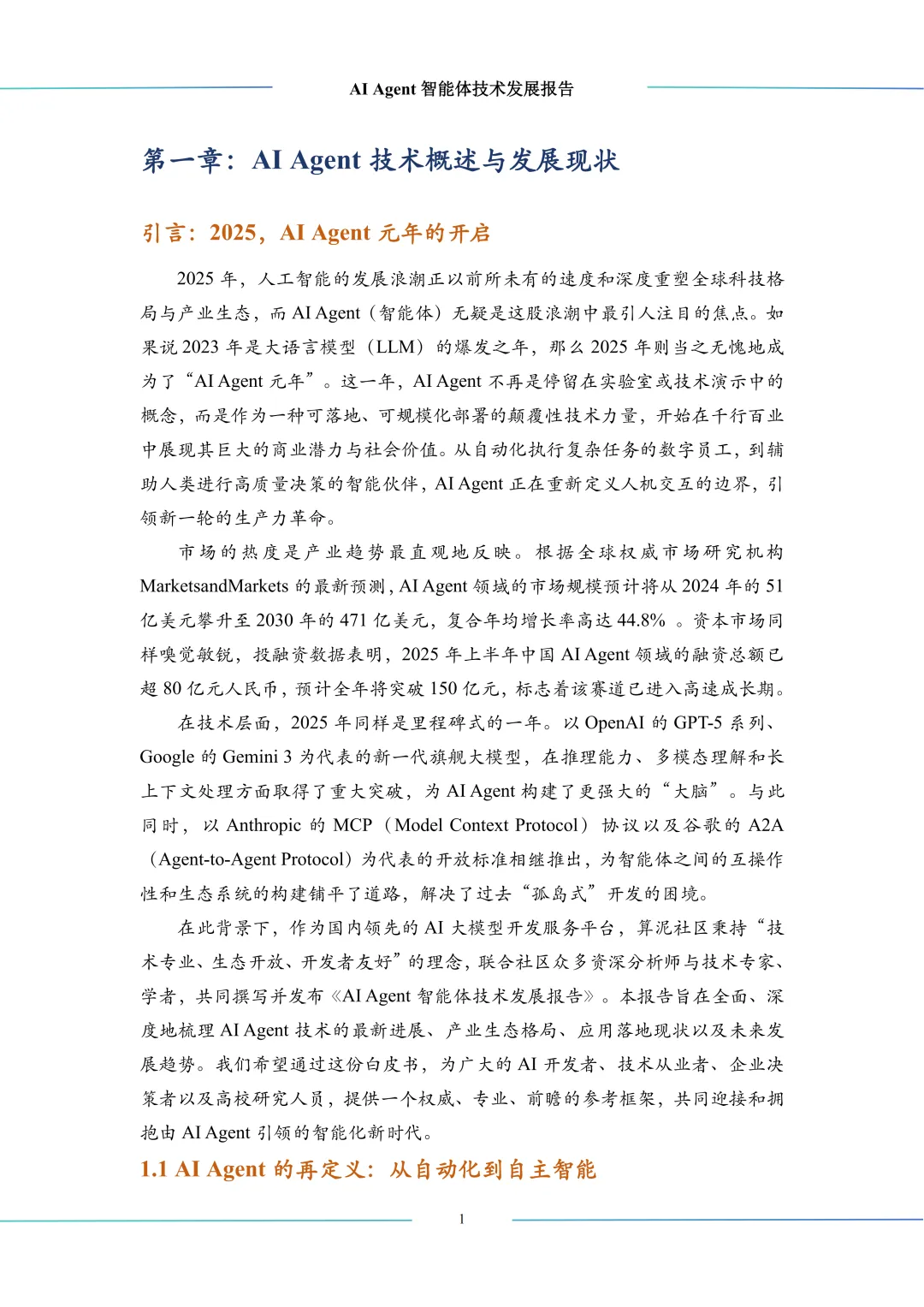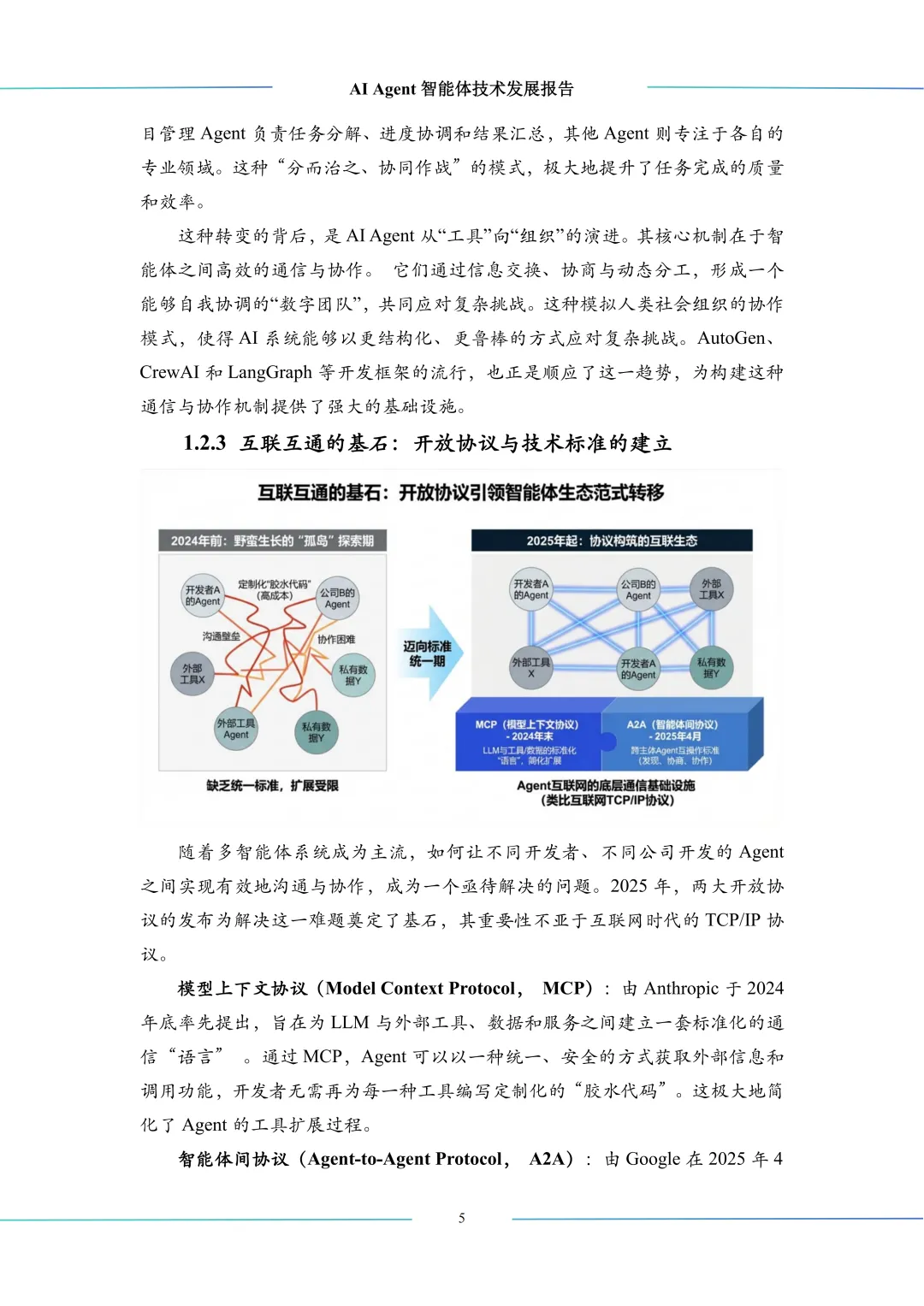 2025年,AI Agent领域迎来三大突破。一是基座大模型持续进化,以更强性能驱动智能提升。二是多智能体系统成为主流,从单体转向协同,应对现实复杂挑战。三是开放协议如模型上下文协议(Model Context Protocol, MCP)和智能体间协议(Agent-to-Agent Protocol, A2A)落地,为互联互通奠定标准基石,推动产业从探索迈向生态构建,支撑Agent互联网发展。