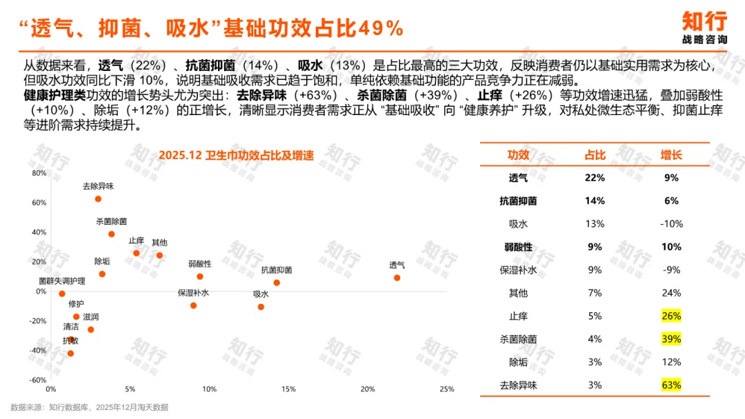 功效需求数据揭示了消费心智的深刻变迁。透气、抗菌抑菌、吸水三大基础功效合计占比49%,仍是核心诉求,但吸水功效同比大幅下滑10%,表明基础吸收需求趋于饱和,单纯依赖功能的产品竞争力衰减。与此同时,健康护理类功效呈现爆发式增长:去除异味(+63%)、杀菌除菌(+39%)、止痒(+26%)增速迅猛,弱酸性(+10%)、除垢(+12%)也保持正增长。
