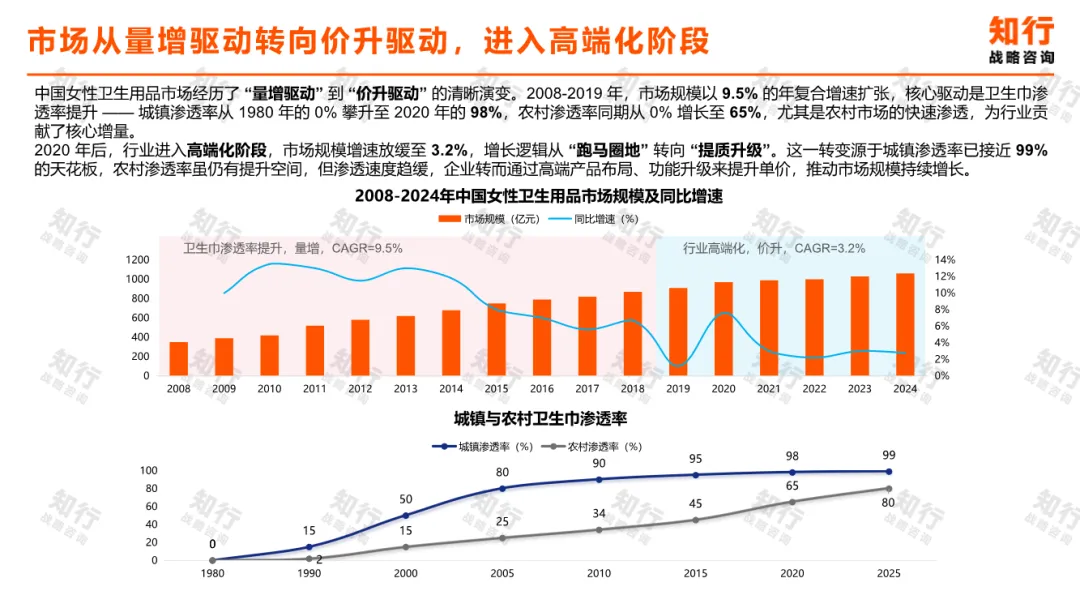 报告清晰勾勒出中国女性卫生用品市场四十年的演进轨迹。2008-2019年是行业的"黄金扩张期",市场规模以9.5%的年复合增速快速扩容,核心驱动力来自普及率提升——城镇渗透率从1980年的0%飙升至2020年的98%,农村渗透率同期从0%增长至65%,尤其是农村市场的渗透贡献了大量增量。这一阶段是"跑马圈地"式的广度扩张,企业靠渠道下沉与基础产品覆盖实现规模增长。