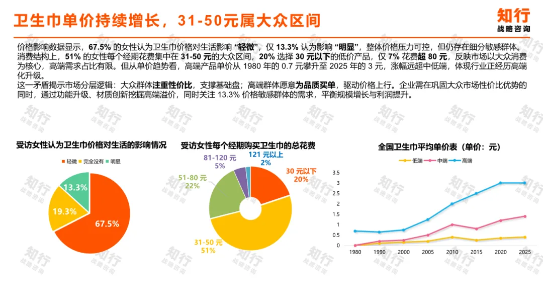 价格结构印证了这一判断:67.5%的女性认为卫生巾价格对生活影响"轻微",仅13.3%感到"明显"压力,整体价格承受力较强。消费集中在31-50元的"大众区间",占比51%,但高端产品单价从1980年的0.7元攀升至2025年的3元,涨幅远超中低端,说明市场存在清晰的"价值分层"——大众群体注重性价比,高端群体愿意为品质支付溢价。企业必须在巩固基础盘的同时,挖掘功能升级带来的溢价空间。