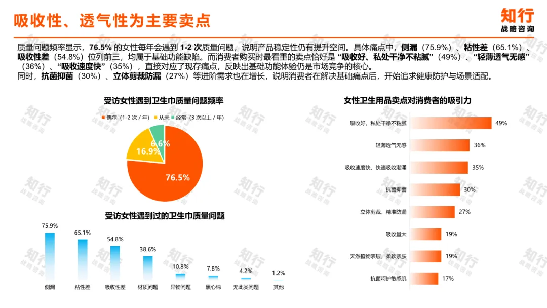 质量问题数据提供了反向印证:76.5%的女性每年会遇到1-2次质量问题,侧漏(75.9%)、粘性差(65.1%)、吸收性差(54.8%)的痛点发生率极高,构成体验改善的刚性需求。这要求品牌必须在稳固基础功能的同时,快速响应健康化、精细化、场景化的功效升级诉求。
