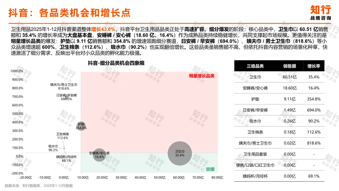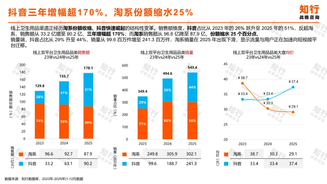 这是一份由知行战略咨询集团发布的2025年卫生巾品类数据观察报告,核心揭示了在抖音电商冲击下,女性卫生用品市场正经历结构性变革与高端化转型的关键窗口期。报告以淘天和抖音双平台数据为基石,系统剖析了品类增长逻辑、渠道迁徙路径、品牌竞争格局与创新突围样本,其本质是存量市场中一场由渠道革命与需求升级共同驱动的价值链重塑。