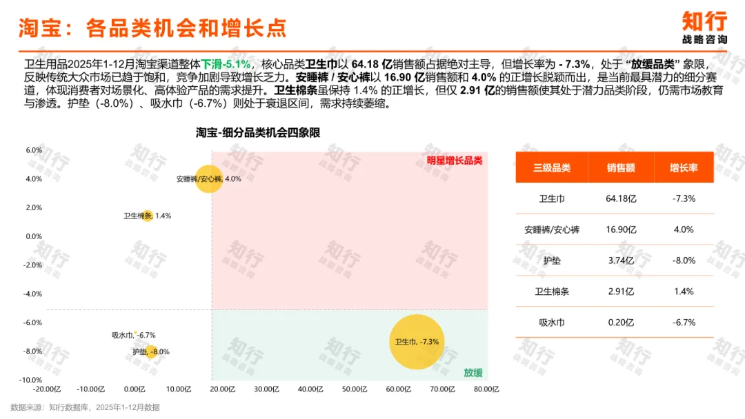 反观淘系,均价从38.7元跌至29.1元,反映平台竞争加剧、低价策略挤压利润。2025年淘宝渠道整体下滑-5.1%,核心品类卫生巾以64.18亿销售额占据绝对主导,但增长率为-7.3%,进入"放缓品类"象限。安睡裤/安心裤以16.90亿销售额和4.0%正增长成为潜力赛道,护垫、吸水巾则处于衰退区间。