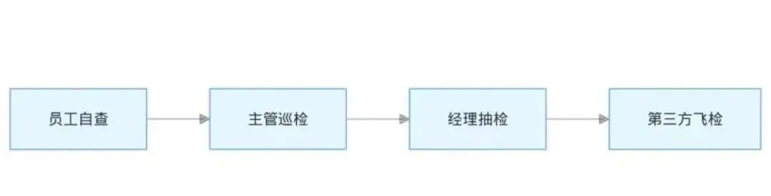 A[员工自查] --> B[主管巡检]--> C[经理抽检] --> D[第三方飞检] |