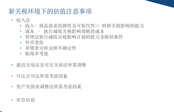 梁国恩先生介绍了新关税环境下的估值注意事项包括:收入法、最近交易法及可比交易法的调整、资产负债表调整法等内容。