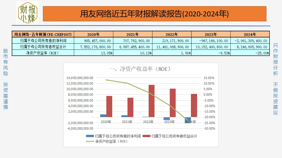 2020年至2024年,用友网络的归母净利润分别为9.85亿元、7.08亿元、2.19亿元、-9.67亿元、-20.61亿元,净资产分别为75.52亿元、69.87亿元、114.61亿元、101.52亿元、82.47亿元,净资产收益率分别为13.05%、10.13%、1.91%、-9.53%、-25.00%,一直低于15%,股东回报率低,资产盈利如旱地栽花,难以绽放。