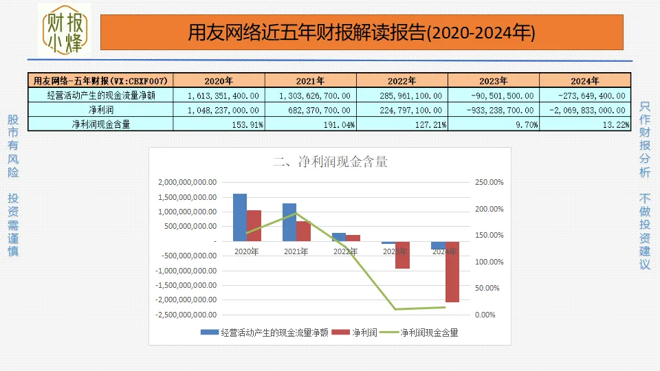 2020年至2024年,用友网络的净利润分别为10.48亿元、6.82亿元、2.25亿元、-9.33亿元、-20.70亿元,净利润现金含量分别为153.91%、191.04%、127.21%、9.70%、13.22%,整体大于100%,但后两年大幅下降,现金创造能力后劲不足。