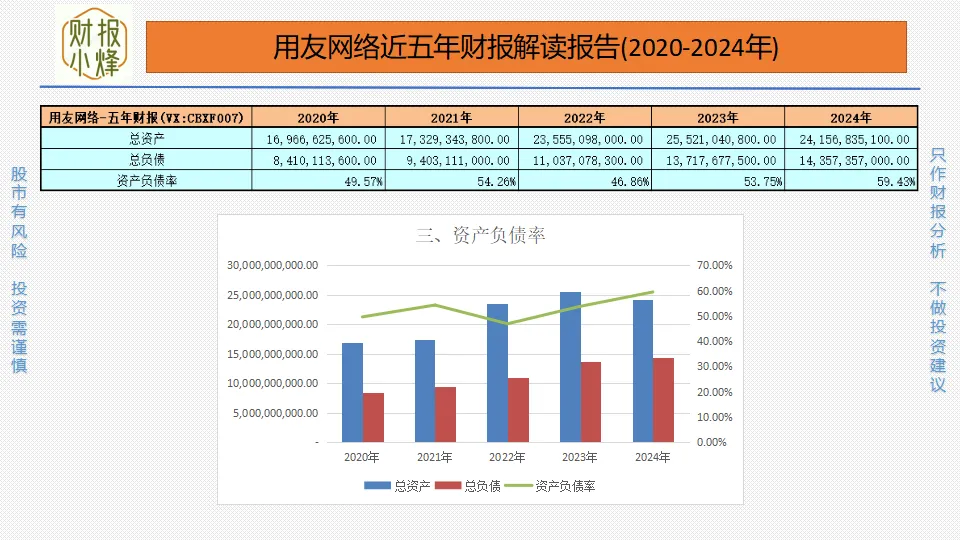 2020年至2024年,用友网络的总资产分别为169.67亿元、173.29亿元、235.55亿元、255.21亿元、241.57亿元,总负债分别为84.10亿元、94.03亿元、110.37亿元、137.18亿元、143.57亿元,资产负债率分别为49.57%、54.26%、46.86%、53.75%、59.43%,一直低于60%,但呈波动上升趋势,偿债风险渐增。