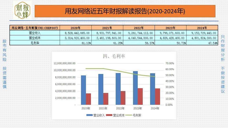 2020年至2024年,用友网络的营业收入分别为85.28亿元、89.32亿元、92.62亿元、97.96亿元、91.53亿元,营业成本分别为33.15亿元、34.61亿元、40.41亿元、48.26亿元、48.02亿元,毛利率分别为61.13%、61.25%、56.37%、50.73%、47.54%,一直大于40%,但呈下降趋势,产品竞争力减弱,盈利能力如夕阳西下,光芒渐褪。