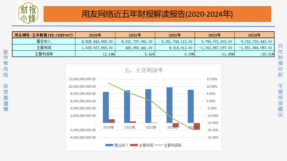 2020年至2024年,用友网络的主营利润分别为10.36亿元、4.83亿元、0.80亿元、-11.64亿元、-18.32亿元,主营利润率分别为12.14%、5.41%、0.09%、-11.88%、-20.01%,一直低于15%,且后两年为负,核心盈利能力强弩之末,犹如枯井求水,难以为继。