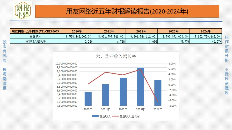 2020年至2024年,用友网络的营业收入分别为85.28亿元、89.32亿元、92.62亿元、97.96亿元、91.53亿元,营业收入增长率分别为0.22%、4.73%、3.69%、5.77%、-6.57%,一直低于10%,成长性不足,行业地位如逆水行舟,不进则退。