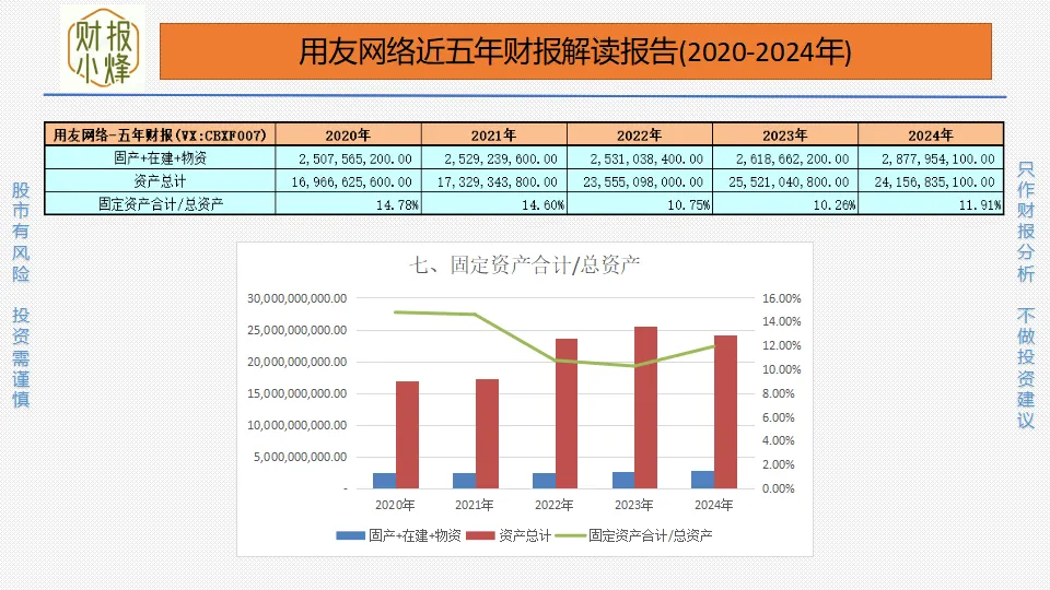 2020年至2024年,用友网络的固定资产与在建工程、工程物资合计分别为25.08亿元、25.29亿元、25.31亿元、26.19亿元、28.78亿元,其占总资产比值分别为14.78%、14.60%、10.75%、10.26%、11.91%,一直低于40%,属于轻资产运营,成本控制灵活,宛如敏捷的猎豹,竞争力良好。
