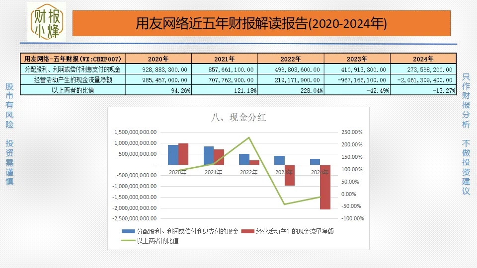 2020年至2024年,用友网络的现金分红金额分别为9.29亿元、8.58亿元、5.00亿元、4.11亿元、2.74亿元,现金分红率分别为94.26%、121.18%、228.04%、-42.49%、-13.27%,平均值77.54%大于20%,但后两年为负,分红慷慨性如昙花一现,难以持续。