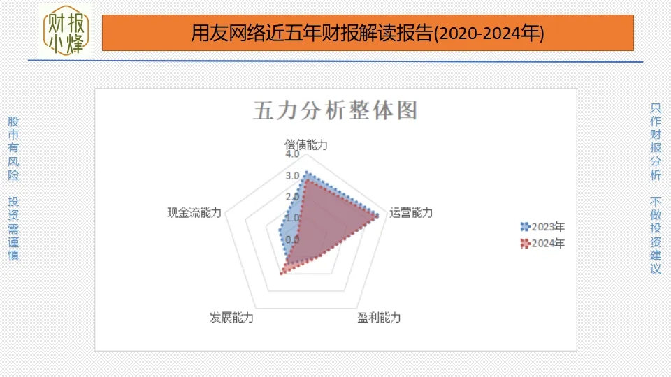 用友网络的偿债能力与去年同期相比略有下降,但仍保持在中等水平;运营能力与去年同期相比持平,保持在中等水平;盈利能力与去年同期相比持平,保持在低水平;发展能力与去年同期相比略有提升,由低水平提升至中低水平;现金流能力与去年同期相比略有下降,但仍保持在低水平;整体来看“五力”略有下降。
