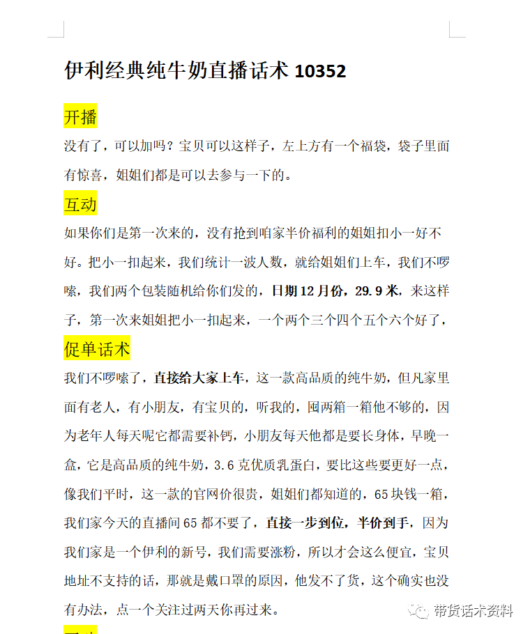 话术简介:经典纯牛奶,脱脂牛奶, 介绍:介绍产品的配料成分和价格福利,生产日期新鲜,产品保证营养价值高,适用那些人群喝,与用户互动成交订单。元气森林,各个口味的元气森林的话术。。是完整的直播话术,从开播到下播。