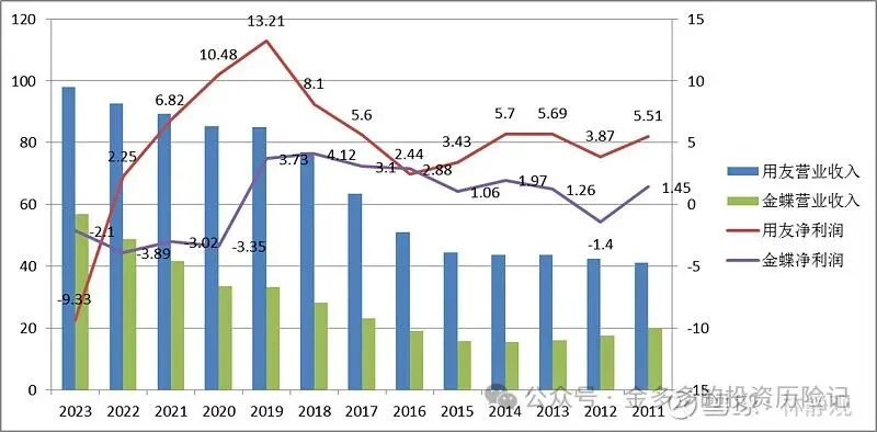 在第一篇行业生意模式介绍中,企业管理软件行业的利润很薄,费用占比很大,基本靠政府补贴和税费返还活着,所以当研发费用大增再叠加上经济周期,那么利润就会周期性的波动。对于在二级市场估值较高,又被归为成长股的用友和金蝶股价自然就会大起大落,表现和周期股一样。
