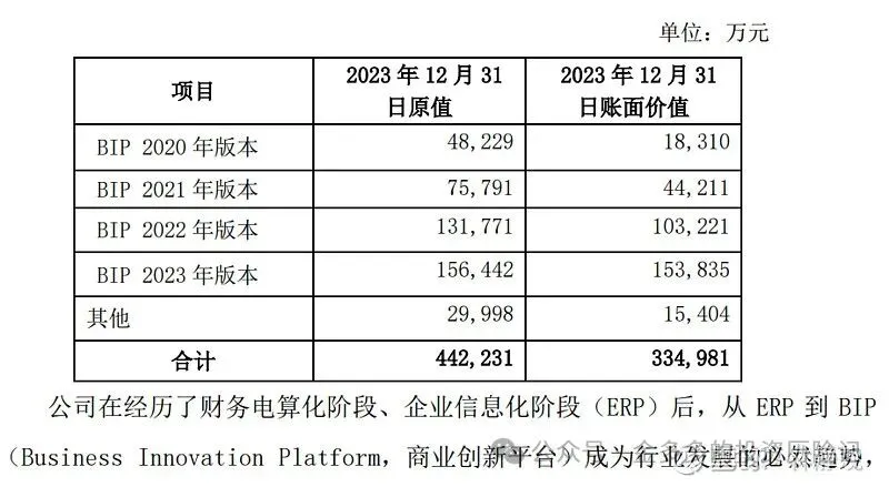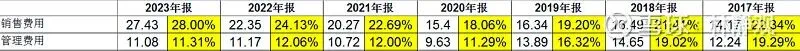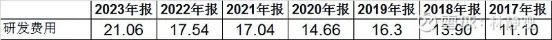 上面这段话介绍了公司的产品发展大阶段,每过5-10年产品就会因为技术更新而进行重大升级,这段时间的研发费用就会大增,配合新产品的推出同时的市场和销售费用也会增加。以上图用友为例,这次的BIP产品的研发,持续4年时间,累计已投入45个亿,无形资产按照5年摊销,那么每年就会有9个亿的研发费用,这还没有算上当年就发生的研发费用(用友年报中研发资本化率大概50%)和老产品的维护型研发费用。下表示用友今年的研发费用,2023年相对2017年研发费用翻倍了。