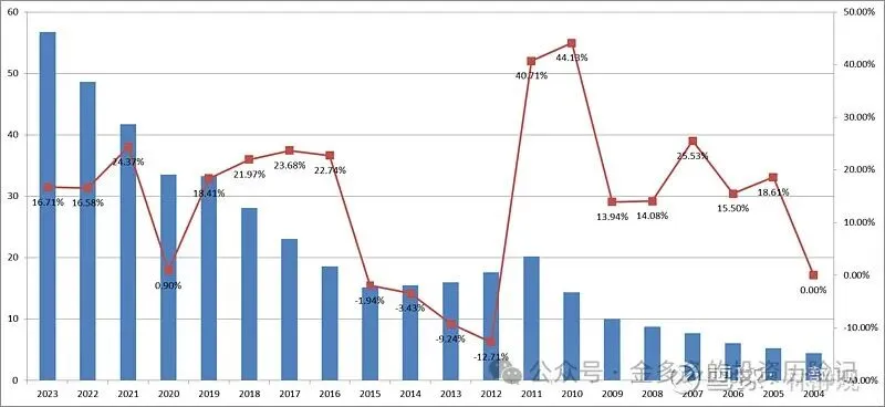 从2004年的4.46亿到2023年的56.79亿,增长了12.7倍,年复合增长率5.53%