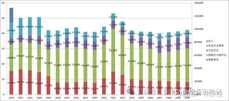1)销售费用是收入占比最大的一项,每一年都是,平均高达50%。