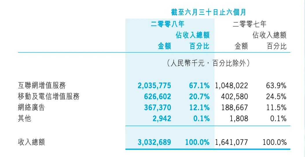 从三大业务来看,截至2008年6月,互联网增值业务同比增长89.9%,环比增长3.8%;移动及电信增值业务同比增长64.2%,环比增长17.4%;网络广告业务同比增长94.4%,环比增长54.1%。