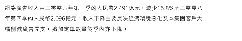 季度数据上,如前面提到的,四季度广告业务出现下滑了,环比下降了15.8%,原因很简单,2008年8月随着雷曼兄弟破产,全球金融危机彻底爆发,导致广告主开始削减广告开支。