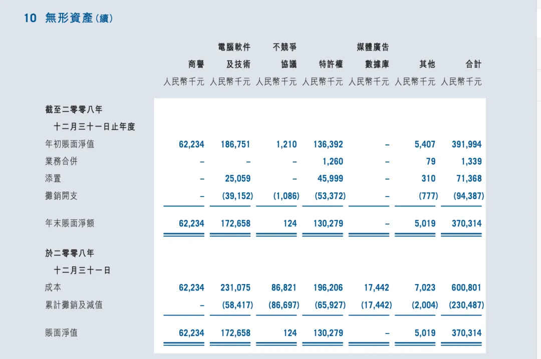无形资产方面,商誉6223万,电脑软件及技术1.72亿元以及特许权1.3亿元,合计3.7亿元,绝对数字比去年少了52.23%,少的部分主要是特许权从去年的3.55亿元减少到今年的1.72亿元,少了快2亿元。