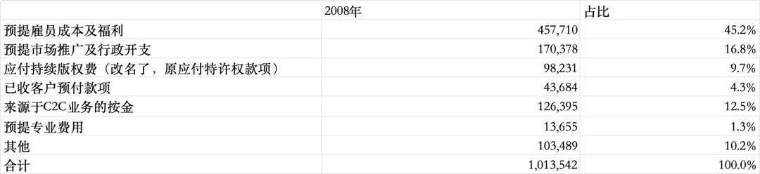 再来看负债端,37%其他应付款及计提费用,24.9%递延费用以及8.9%应付账款,无任何有息负债。
