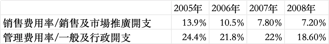 2008年的腾讯继续享受到流量的威力,将其他功能导入QQ,获得QQ所带来的流量加持,大幅降低了广告支出,销售费用率创下上市以来的新低(9.5%-13.9%-10.5%-7.8%-7.2%)