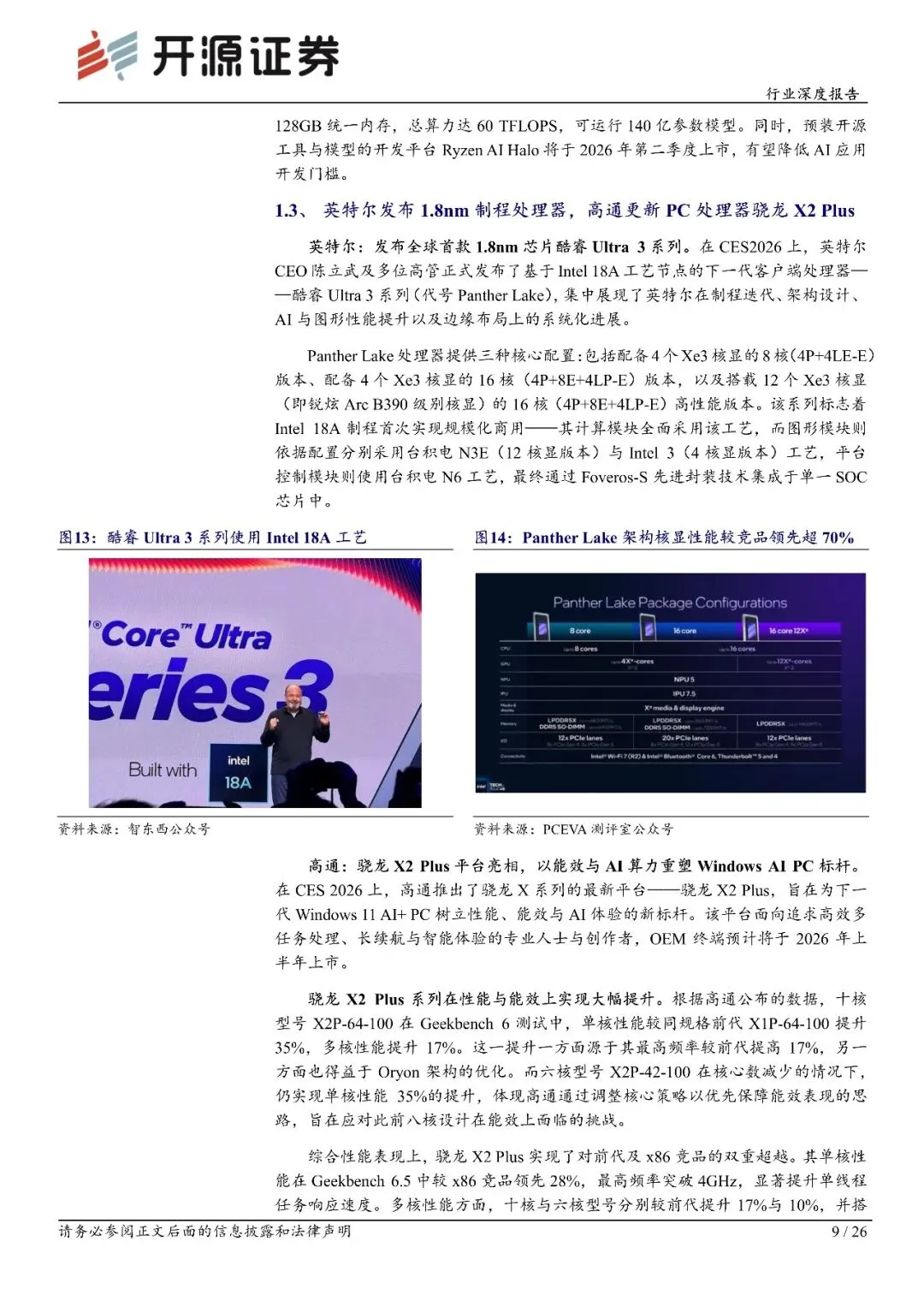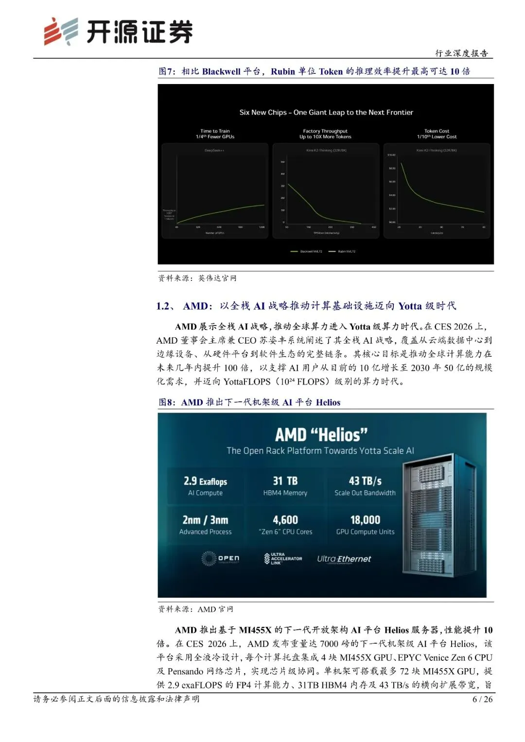 AI芯片:芯片架构/制程工艺持续选代,AI推理能效提升、成本下降AI芯片方面,CES2026英伟达、AMD、英特尔、高通等科技巨头均有亮相。英伟达宣布VeraRubin平台全面投产,Rubin平台整合6颗关键芯片,打造全新的力、网络与存储架构,在大幅提升性能的同时,AI推理成本降低10倍。AMD展示其全栈AI战略,推动全球算力未来进入YottaFLOPS级B时代,其推出的基于MI455X的AI平台Helios性能较前代提升10倍,并获得OpenA【等头部客户认可。英特尔率先发布基于18A工艺的酷睿Ultra3系列处理器,核显性能较竞品领先超70%。高通则推出骁龙X2Plus平台,以更高能效重塑WindowsAIPC标杆。联想提出"混合AI"战略,联合芯片厂商构建"或岗边-云"全栈能力。整体来看,随着芯片架构和制程工艺选代,AI推理性能持续提升,成本持续下降。