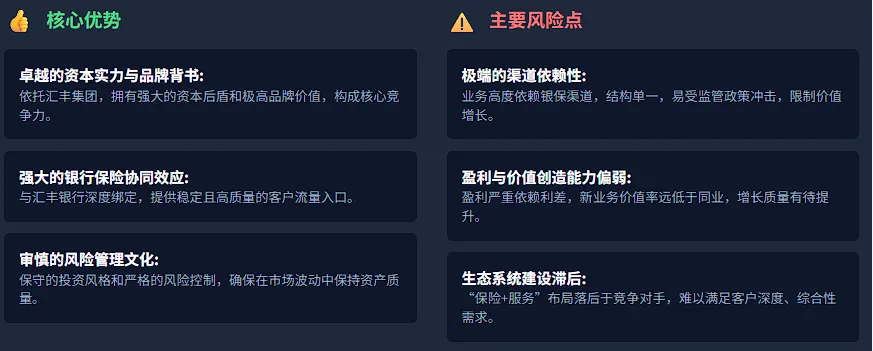 运营与战略焦点:高度聚焦的渠道结构。 这是公司战略的核心特点。对银保渠道的高度聚焦,使其商业模式展现出高度的专业化。这也对公司提出了持续优化产品组合、提升价值创造能力的要求,并需要灵活适应银保渠道的监管政策动态。公司与汇丰银行的协同合作关系是其业务发展的基石,其稳定性至关重要。