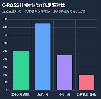 偿付能力是衡量保险公司财务健康状况的首要指标。汇丰人寿在此项表现卓越,远超监管红线,为其业务运营提供了极高的安全边际。
